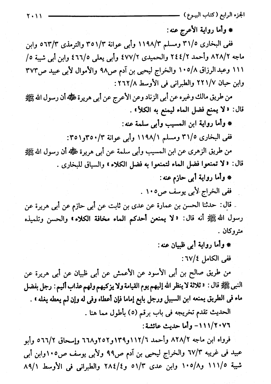 من طريق الزهرى عن ابن المسيب وأبى سلمة عن أبى هريرة - رضي الله عنه - أن رسول الله - صلى الله عليه وسلم - قال: "لا تمنعوا فضل الماء لتمنعوا به فضل الكلاء" والسياق للبخاري.