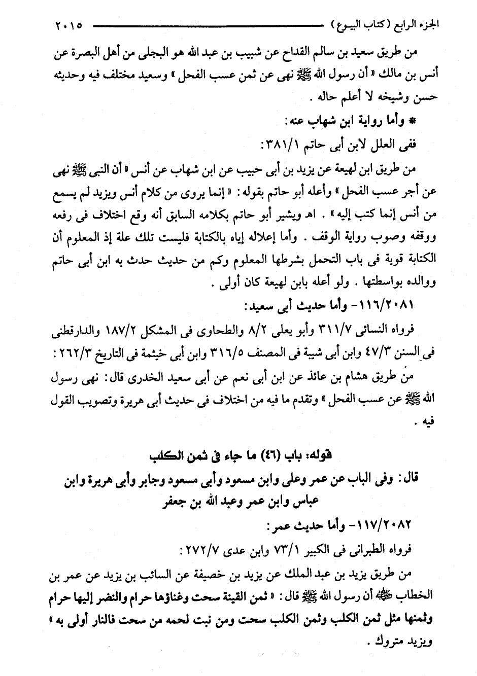 من طريق ابن لهيعة عن يزيد بن أبى حبيب عن ابن شهاب عن أنس "أن النبي - صلى الله عليه وسلم - نهى عن أجر عسب الفحل" وأعله أبو حاتم بقوله: "إنما يروى من كلام أنس ويزيد لم يسمع من أنس إنما كتب إليه". اهـ ويشير أبو حاتم بكلامه السابق أنه وقع اختلاف في رفعه ووقفه وصوب رواية الوقف. وأما إعلاله إياه بالكتابة فليست تلك علة إذ المعلوم أن الكتابة قوية في باب التحمل بشرطها المعلوم وكم من حديث حدث به ابن أبى حاتم ووالده بواسطتها. ولو أعله بابن لهيعة كان أولى.