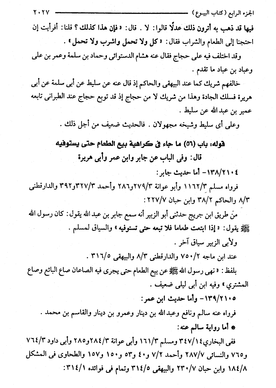 من طريق ابن جريج حدثنى أبو الزبير أنه سمع جابر بن عبد اللَّه يقول: كان رسول اللَّه - صلى اللَّه عليه وسلم - يقول: "إذا ابتعت طعاما فلا تبعه حتى تستوفيه" والسياق لمسلم.