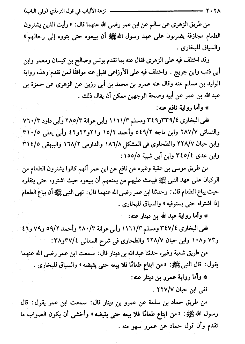 من طريق موسى بن عقبة وغيره عن نافع عن ابن عمر أنهم كانوا يشترون الطعام من الركبان على عهد النبي - صلى اللَّه عليه وسلم - فيبعث عليهم من يمنعهم أن يبيعوه حيث اشتروه حتى ينقلوه حيث يباع الطعام قال: وحدثنا ابن عمر رضى اللَّه عنهما قال: نهى النبي - صلى اللَّه عليه وسلم - أن يباع الطعام إذا اشتراه حتى يستوفيه" والسياق للبخاري.