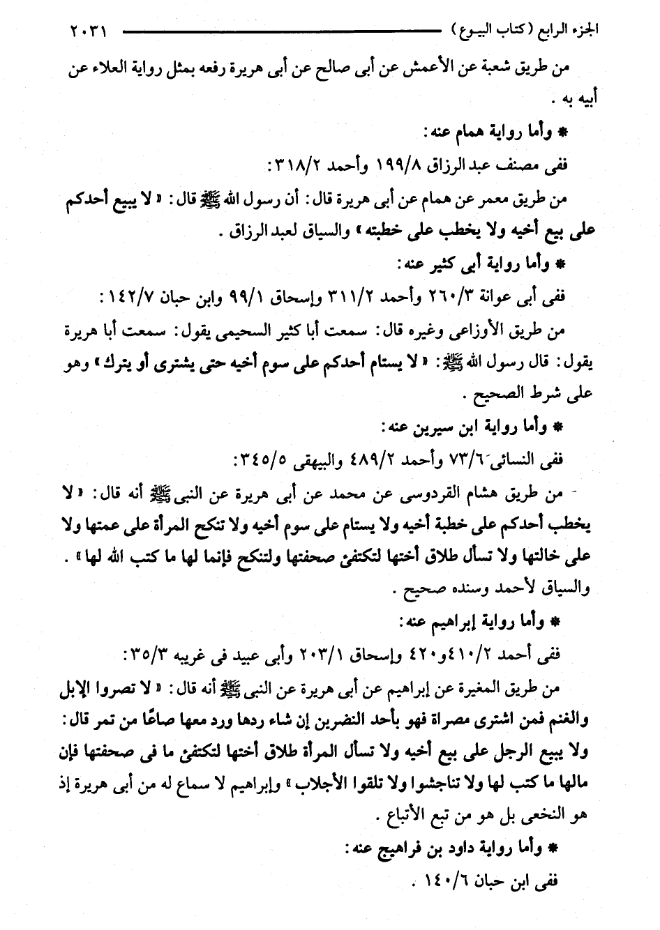 من طريق الأوزاعى وغيره قال: سمعت أبا كثير السحيمى يقول: سمعت أبا هريرة يقول: قال رسول اللَّه - صلى اللَّه عليه وسلم -: "لا يستام أحدكم على سوم أخيه حتى يشترى أو يترك" وهو على شرط الصحيح.