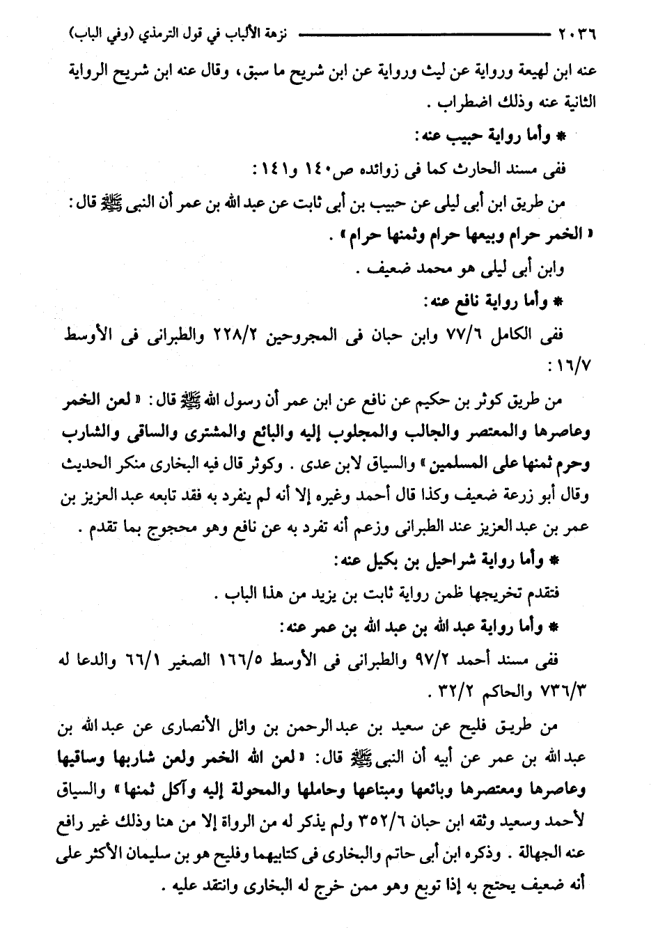 من طريق فليح عن سعيد بن عبد الرحمن بن وائل الأنصارى عن عبد اللَّه بن عبد اللَّه بن عمر عن أبيه أن النبي - صلى اللَّه عليه وسلم - قال: "لعن اللَّه الخمر ولعن شاربها وساقيها وعاصرها ومعتصرها وبائعها ومبتاعها وحاملها والمحولة إليه وآكل ثمنها" والسياق لأحمد وسعيد وثقه ابن حبان 6/ 352 ولم يذكر له من الرواة إلا من هنا وذلك غير رافع عنه الجهالة. وذكره ابن أبي حاتم والبخاري في كتابيهما وفليح هو بن سليمان الأكثر على أنه ضعيف يحتج به إذا توبع وهو ممن خرج له البخاري وانتقد عليه.