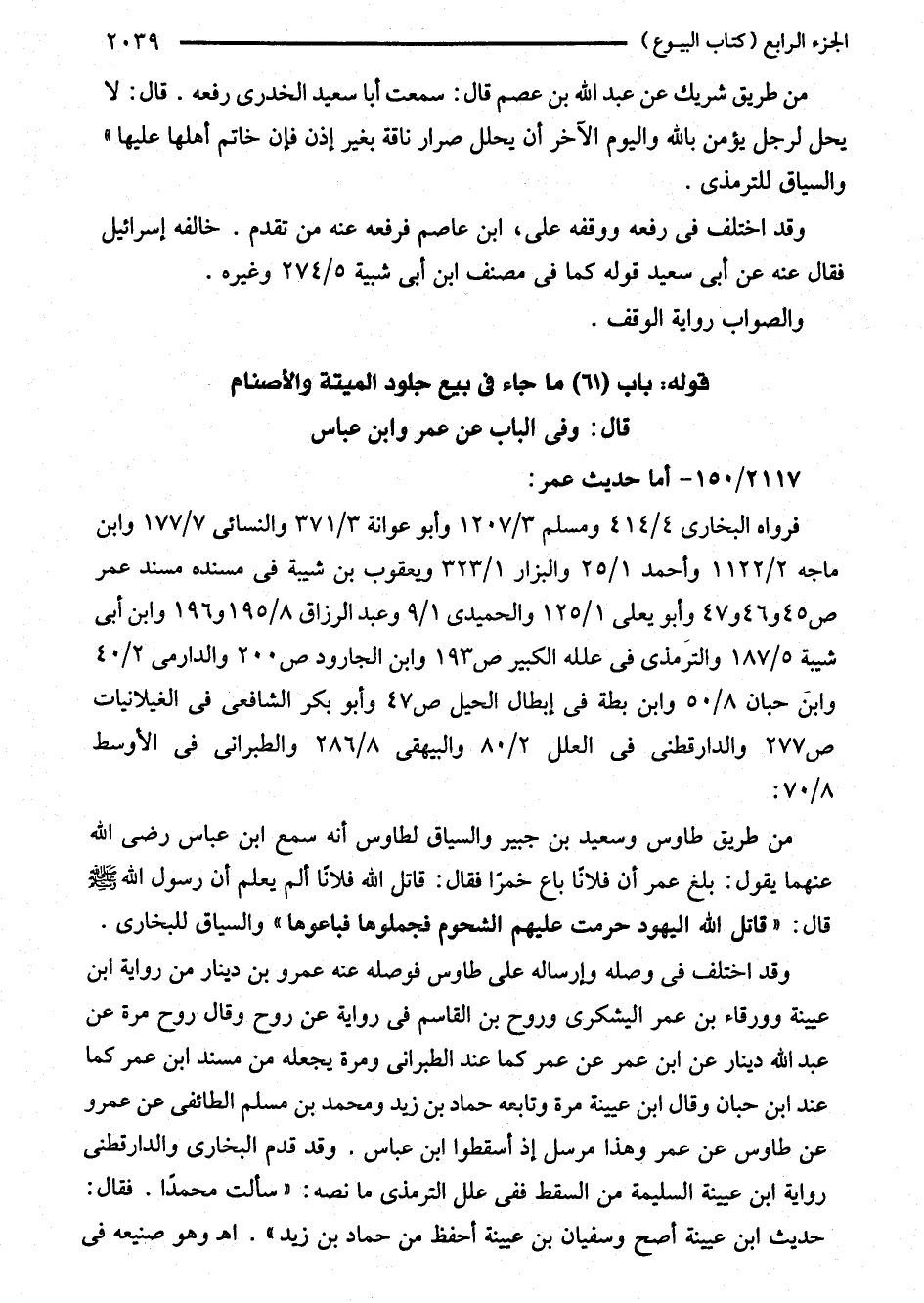 من طريق طاوس وسعيد بن جبير والسياق لطاوس أنه سمع ابن عباس رضى اللَّه عنهما يقول: بلغ عمر أن فلانًا باع خمرًا فقال: قاتل اللَّه فلانًا ألم يعلم أن رسول اللَّه - صلى اللَّه عليه وسلم - قال: "قاتل اللَّه اليهود حرمت عليهم الشحوم فجملوها فباعوها" والسياق للبخاري.