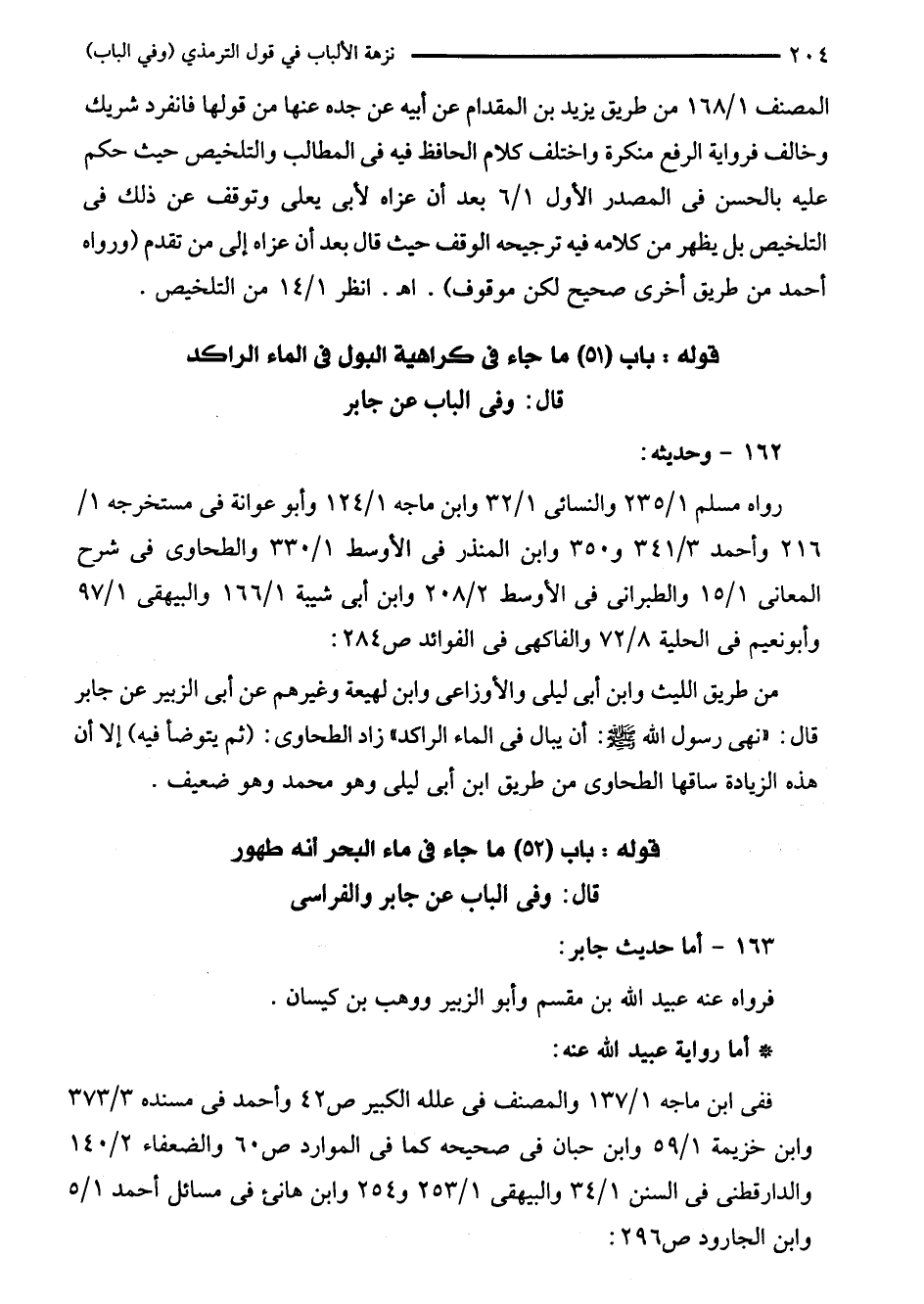 من طريق الليث وابن أبى ليلى والأوزاعى وابن لهيعة وغيرهم عن أبى الزبير عن جابر قال: "نهى رسول الله - صلى الله عليه وسلم -: أن يبال في الماء الراكد" زاد الطحاوى: (ثم يتوضأ فيه) إلا أن هذه الزيادة ساقها الطحاوى من طريق ابن أبى ليلى وهو محمد وهو ضعيف.