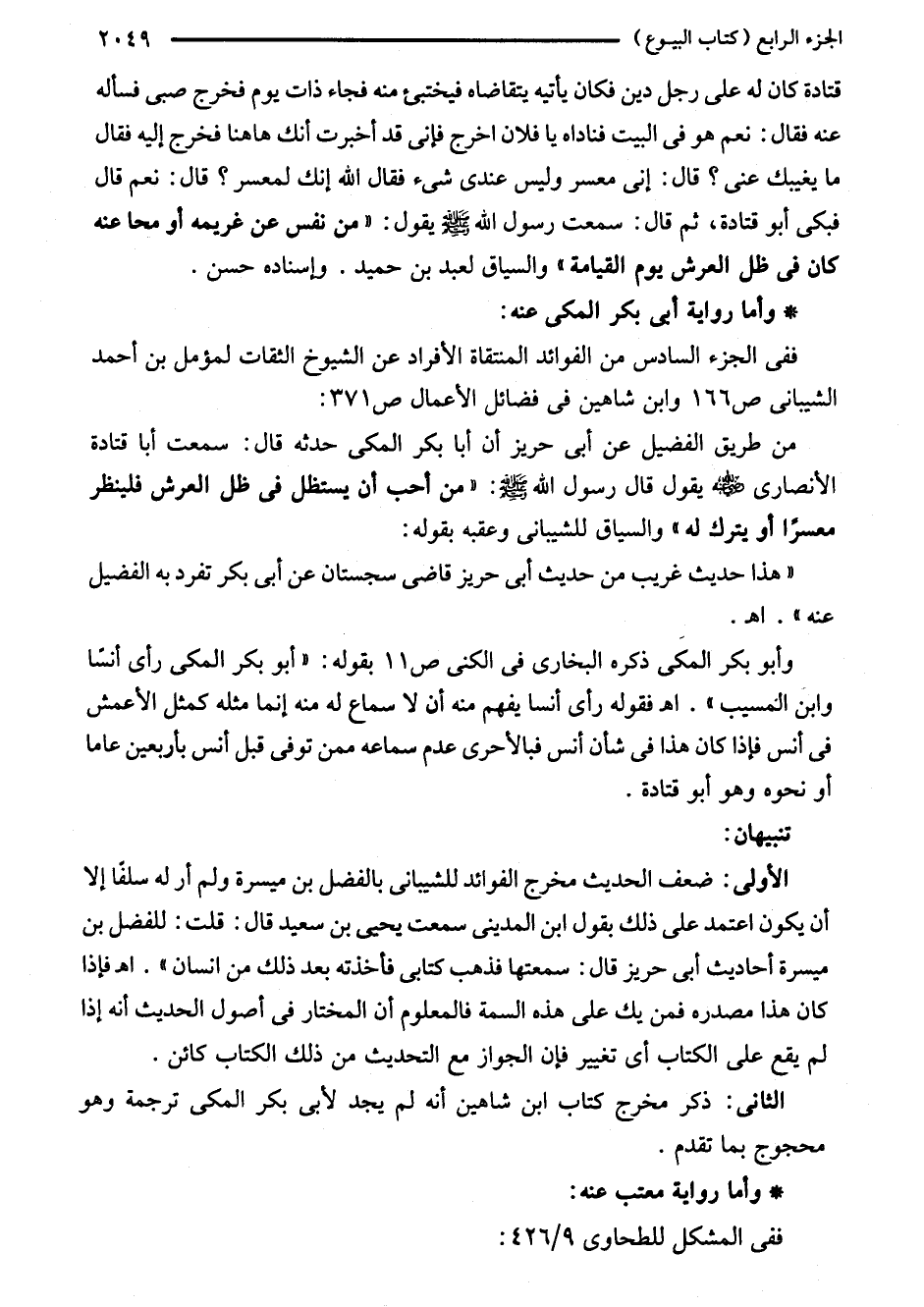 من طريق الفضيل عن أبي حريز أن أبا بكر المكى حدثه قال: سمعت أبا قتادة الأنصارى -رضي اللَّه عنه- يقول قال رسول اللَّه - صلى اللَّه عليه وسلم -: "من أحب أن يستظل في ظل العرش فلينظر معسرًا أو يترك له" والسياق للشيبانى وعقبه بقوله: