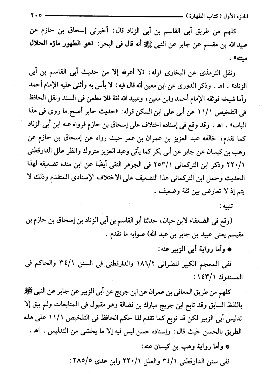 كلهم من طريق أبى القاسم بن أبى الزناد قال: أخبرنى إسحاق بن حازم عن عبيد الله بن مقسم عن جابر عن النبي - صلى الله عليه وسلم - أنه قال في البحر: "هو الطهور ماؤه الحلال ميتته".
