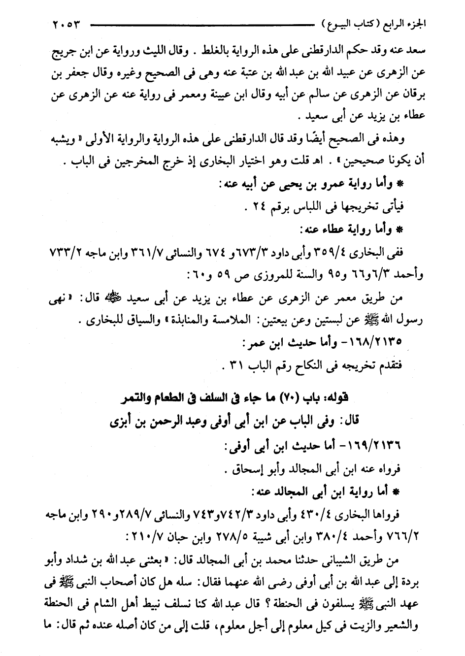 من طريق الشيبانى حدثنا محمد بن أبي المجالد قال: "بعثنى عبد اللَّه بن شداد وأبو بردة إلى عبد اللَّه بن أبي أوفى رضى اللَّه عنهما فقال: سله هل كان أصحاب النبي - صلى اللَّه عليه وسلم - في عهد النبي - صلى اللَّه عليه وسلم - يسلفون في الحنطة؟ قال عبد اللَّه كنا نسلف نبيط أهل الشام في الحنطة والشعير والزيت في كيل معلوم إلى أجل معلوم، قلت إلى من كان أصله عنده ثم قال: ما