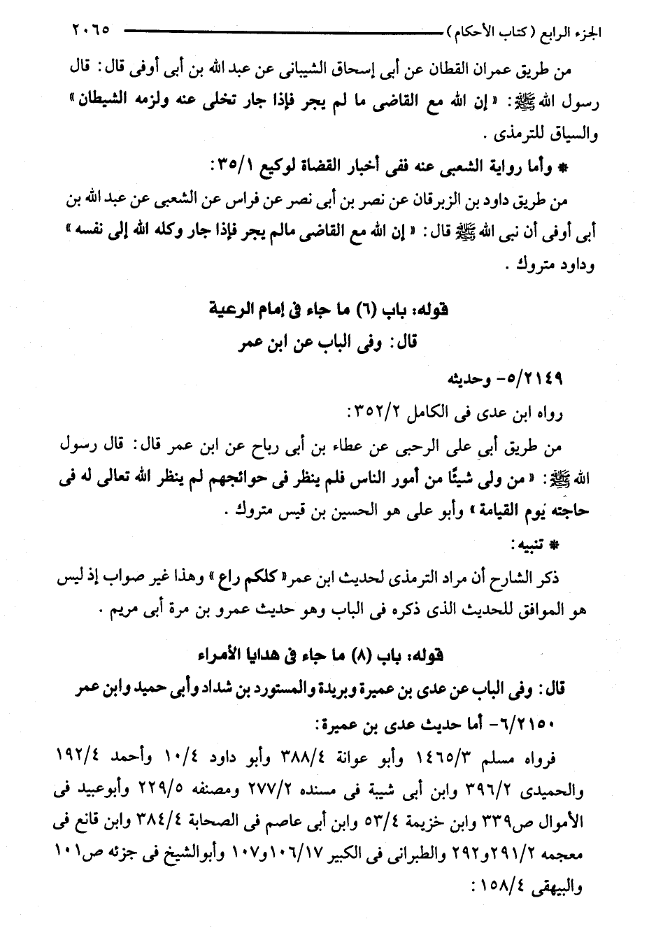 من طريق عمران القطان عن أبي إسحاق الشيبانى عن عبد اللَّه بن أبي أوفى قال: قال رسول اللَّه - صلى اللَّه عليه وسلم -: "إن اللَّه مع القاضى ما لم يجر فإذا جار تخلى عنه ولزمه الشيطان" والسياق للترمذي.