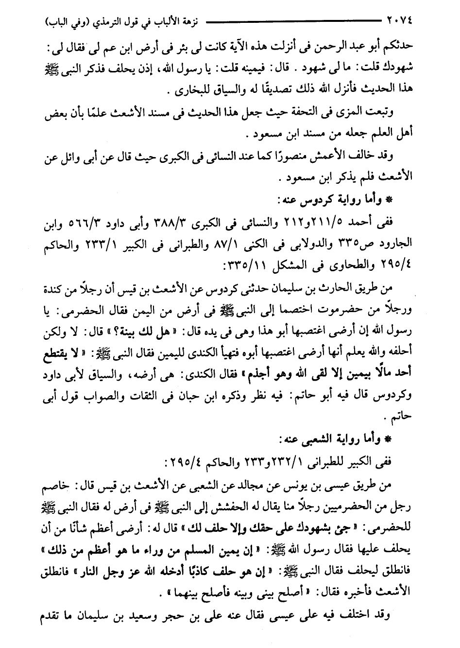 من طريق عيسى بن يونس عن مجالد عن الشعبى عن الأشعث بن قيس قال: خاصم رجل من الحضرميين رجلًا منا يقال له الحفشش إلى النبي - صلى اللَّه عليه وسلم - في أرض له فقال النبي - صلى اللَّه عليه وسلم - للحضرمى: "جئ بشهودك على حقك وإلا حلف لك" قال له: أرضى أعظم شأنًا من أن يحلف عليها فقال رسول اللَّه - صلى اللَّه عليه وسلم -: "إن يمين المسلم من وراء ما هو أعظم من ذلك" فانطلق ليحلف فقال النبي - صلى اللَّه عليه وسلم -: "إن هو حلف كاذبًا أدخله اللَّه عز وجل النار" فانطلق الأشعث فأخبره فقال: "أصلح بينى وبينه فأصلح بينهما".