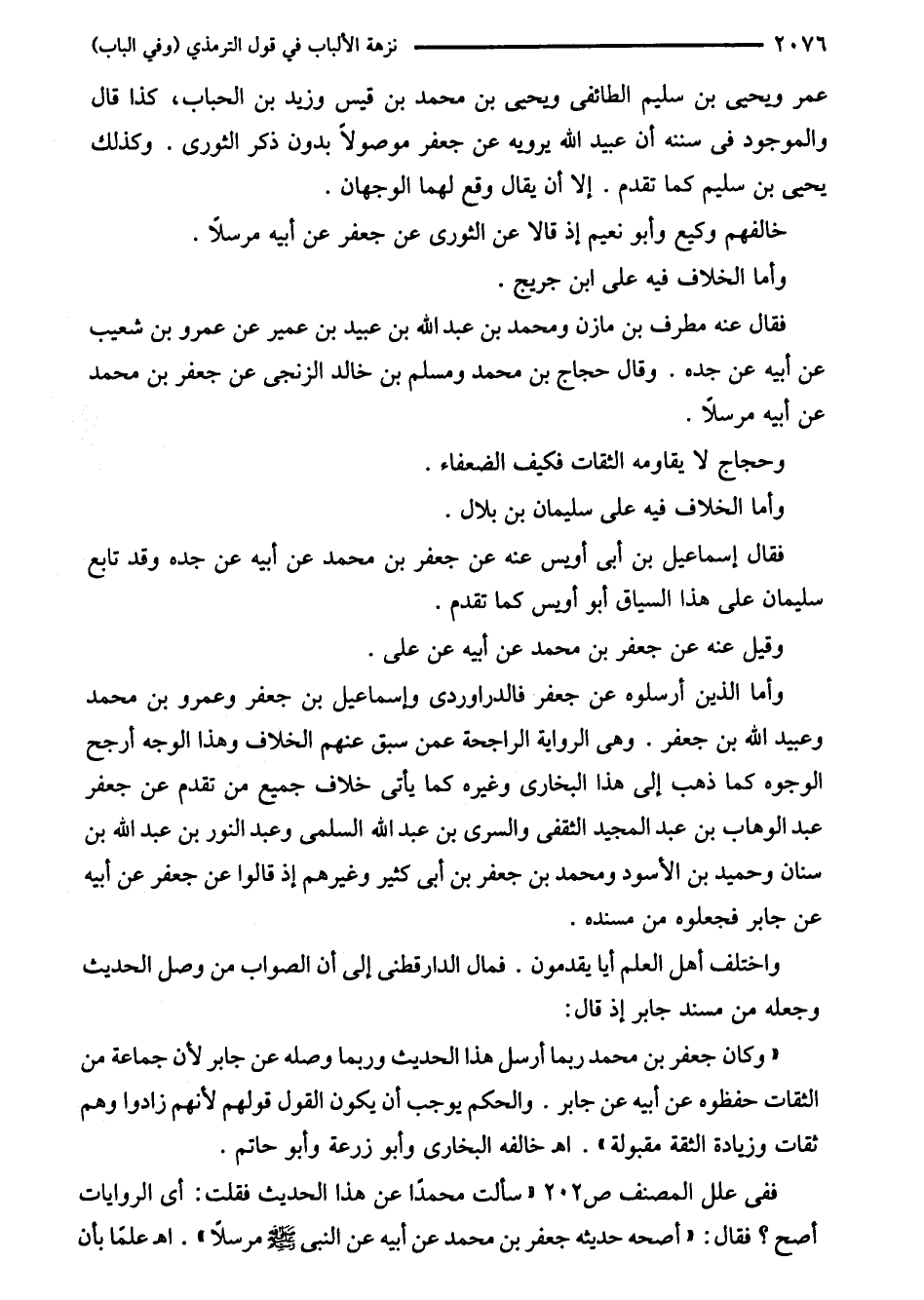 وأما الذين أرسلوه عن جعفر فالدراوردى وإسماعيل بن جعفر وعمرو بن محمد وعبيد اللَّه بن جعفر. وهى الرواية الراجحة عمن سبق عنهم الخلاف وهذا الوجه أرجح الوجوه كما ذهب إلى هذا البخاري وغيره كما يأتى خلف جميع من تقدم عن جعفر عبد الوهاب بن عبد المجيد الثقفي والسرى بن عبد اللَّه السلمى وعبد النور بن عبد اللَّه بن سنان وحميد بن الأسود ومحمد بن جعفر بن أبي كثير وغيرهم إذ قالوا عن جعفر عن أبيه عن جابر فجعلوه من مسنده.