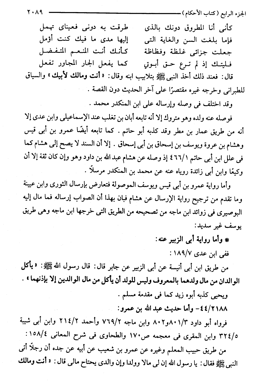 من طريق حبيب المعلم وغيره عن عمرو بن شعيب عن أبيه عن جده أن رجلًا أتى النبي - صلى اللَّه عليه وسلم - فقال: يا رسول اللَّه إن لى مالا وولدا وإن والدى يحتاح مالى قال: "أنت ومالك