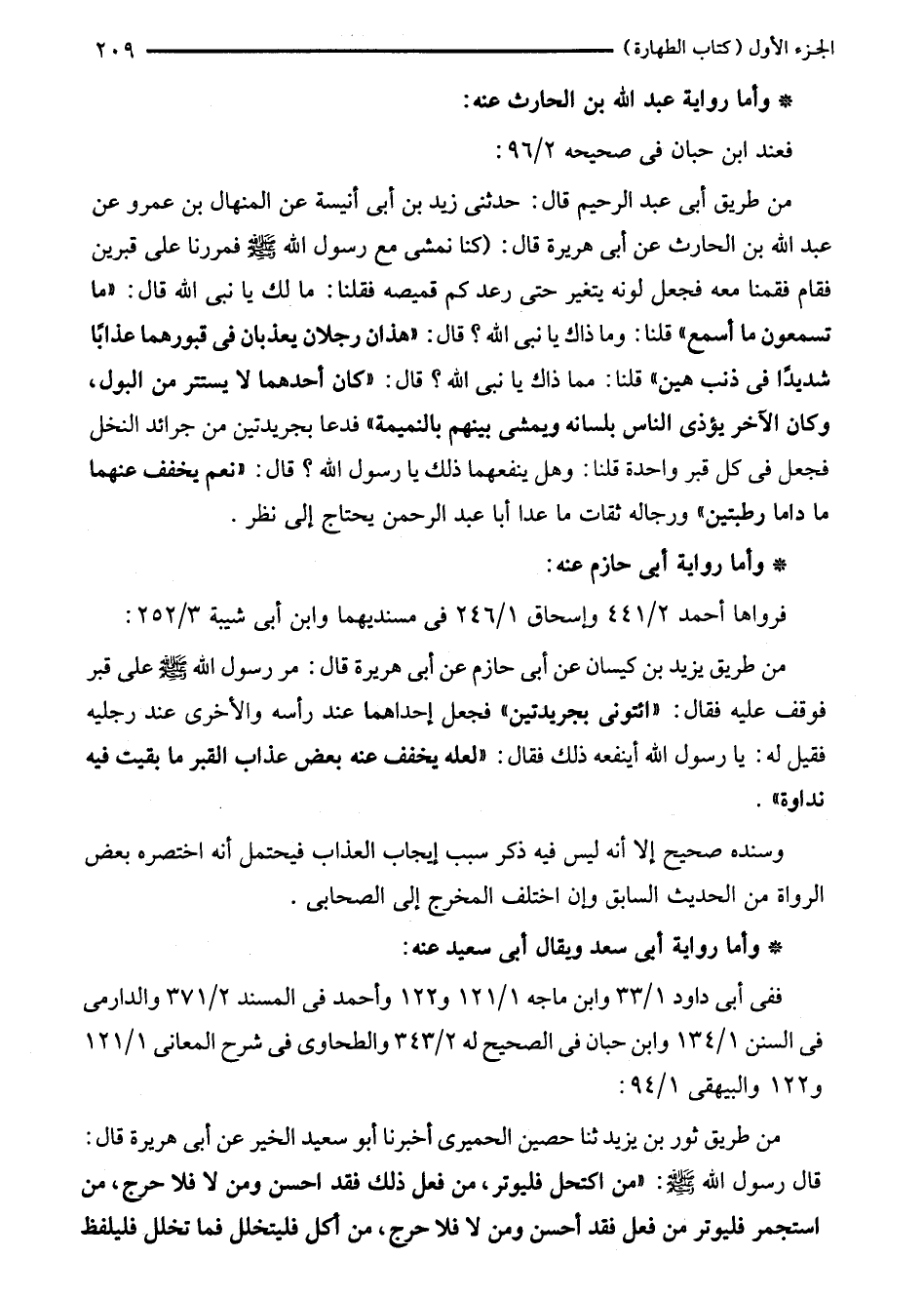 من طريق أبى عبد الرحيم قال: حدثنى زيد بن أبى أنيسة عن المنهال بن عمرو عن عبد الله بن الحارث عن أبى هريرة قال: (كنا نمشى مع رسول الله - صلى الله عليه وسلم - فمررنا على قبرين فقام فقمنا معه فجعل لونه يتغير حتى رعد كم قميصه فقلنا: ما لك يا نبى الله قال: "ما تسمعون ما أسمع" قلنا: وما ذاك يا نبى الله؟ قال: "هذان رجلان يعذبان في قبورهما عذابًا شديدًا في ذنب هين" قلنا: مما ذاك يا نبى الله؟ قال: "كان أحدهما لا يستتر من البول، وكان الآخر يؤذى الناس بلسانه ويمشى بينهم بالنميمة" فدعا بجريدتين من جرائد النخل فجعل في كل قبر واحدة قلنا: وهل ينفعهما ذلك يا رسول الله؟ قال: "نعم يخفف عنهما ما داما رطبتين" ورجاله ثقات ما عدا أبا عبد الرحمن يحتاج إلى نظر.