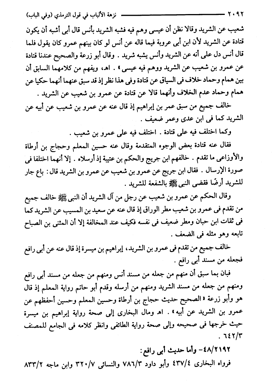 فبان بما سبق أن منهم من جعله من مسند أنس ومنهم من جعله من مسند أبي رافع ومنهم من جعله من مسند الشريد ومنهم من أرسله وقدم أبو حاتم رواية المعلم إذ قال هو وأبو زرعة "الصحيح حديث حجاج بن أرطاة وحسين المعلم وحسين أحفظهم عن عمرو بن الشريد عن أبيه". اهـ ومال البخاري إلى صحة رواية إبراهيم بن ميسرة حيث خرجها في صحيحه والى صحة رواية الطائفى وانظر كلامه في الجامع للمصنف 3/ 642.