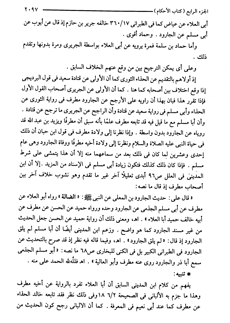 إذ أولاهم بالتقديم عن الحذاء الثورى كما أن الأولى عن قتادة سعيد في قول البرديجى إذا وقع اختلاف بين أصحابه كما هنا. كما أن الأولى عن الجريرى أصحاب القول الأول فإذا تقرر هذا فبان بهذا أن راويه على الأرجح عن الجارود مطرف في رواية الثورى عن الحذاء وأبي مسلم في رواية سعيد عن قتادة وأن الراجح عن الجريرى ما ترجح عن قتادة. وأن أبا مسلم مع ما قيل فيه قد تابعه مطرف علمًا بانه سبق أن مطرفًا ويزيد بن عبد اللَّه قد روياه عن الجارود بدون واسطة. وإذا نظرنا إلى ولادة مطرف في قول ابن حبان أن ذلك في حياة النبي عليه الصلاة والسلام ونظرنا إلى ولادة أخيه مطرفًا ووفاة الجارود وهى عام إحدى وعشرين لما كان في ذلك بعد من سماعهما منه إلا أن هذا يتمشى على شرط مسلم. فإذا كان ذلك كلذلك فتكون زيادة أبي مسلم في الإسناد من المزيد. إلا أن ابن المدينى في العلل ص 96 أبدى تعليلًا آخر غير ما تقدم وهو نشوب خلاف آخر بين أصحاب مطرف إذ قال ما نصه: