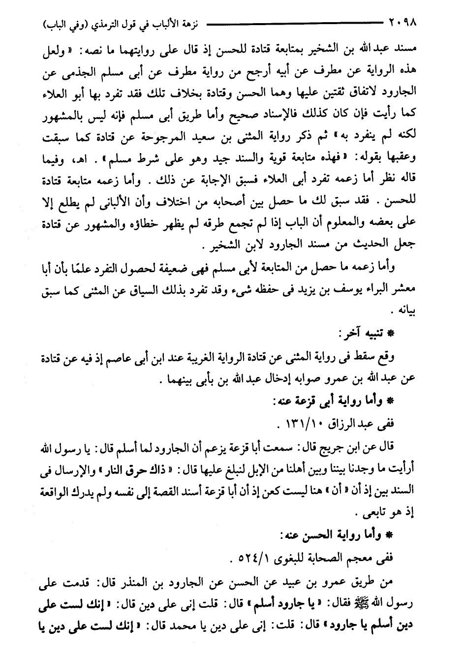 مسند عبد اللَّه بن الشخير بمتابعة قتادة للحسن إذ قال على روايتهما ما نصه: "ولعل هذه الرواية عن مطرف عن أبيه أرجح من رواية مطرف عن أبي مسلم الجذمى عن الجارود لاتفاق ثقتين عليها وهما الحسن وقتادة بخلاف تلك فقد تفرد بها أبو العلاء كما رأيت فإن كان كذلك فالإسناد صحيح وأما طريق أبي مسلم فإنه ليس بالمشهور لكنه لم ينفرد به" ثم ذكر رواية المثنى بن سعيد المرجوحة عن قتادة كما سبقت وعقبها بقوله: "فهذه متابعة قوية والسند جيد وهو على شرط مسلم". اهـ، وفيما قاله نظر أما زعمه تفرد أبي العلاء فسبق الإجابة عن ذلك. وأما زعمه متابعة قتادة للحسن. فقد سبق لك ما حصل بين أصحابه من اختلاف وأن الألبانى لم يطلع إلا على بعضه والمعلوم أن الباب إذا لم تجمع طرقه لم يظهر خطاؤه والمشهور عن قتادة جعل الحديث من مسند الجارود لابن الشخير.