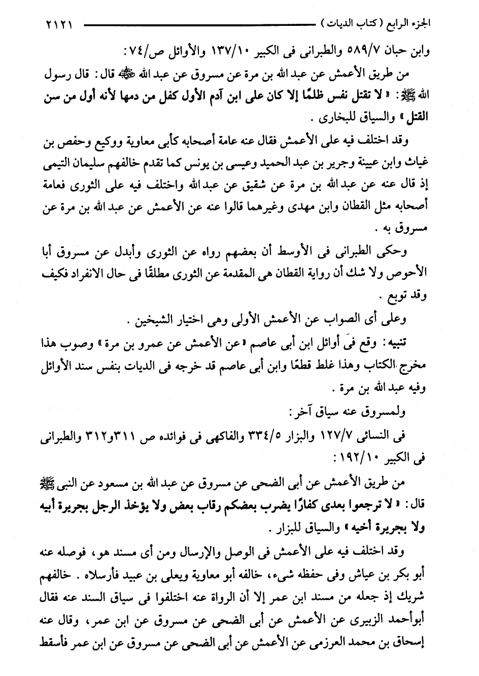 وقد اختلف فيه على الأعمش في الوصل والإرسال ومن أي مسند هو، فوصله عنه أبو بكر بن عياش وفي حفظه شىء، خالفه أبو معاوية ويعلى بن عبيد فأرسلاه. خالفهم شريك إذ جعله من مسند ابن عمر إلا أن الرواة عنه اختلفوا في سياق السند عنه فقال أبو أحمد الزبيرى عن الأعمش عن أبي الضحى عن مسروق عن ابن عمر، وقال عنه إسحاق بن محمد العرزمى عن الأعمش عن أبي الضحى عن مسروق عن ابن عمر فأسقط