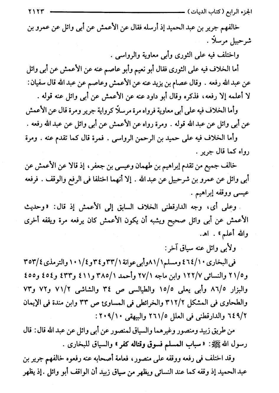 أما الخلاف فيه على الثورى فقال أبو نعيم وأبو عاصم عنه عن الأعمش عن أبي وائل عن عبد اللَّه رفعه. وقال عصام بن يزيد عنه عن الأعمش وعاصم عن عبد اللَّه قال سفيان: لا أعلمه إلا رفعه، فذكره وقال أبو داود عنه عن الأعمش عن أبي وائل عنه قوله.