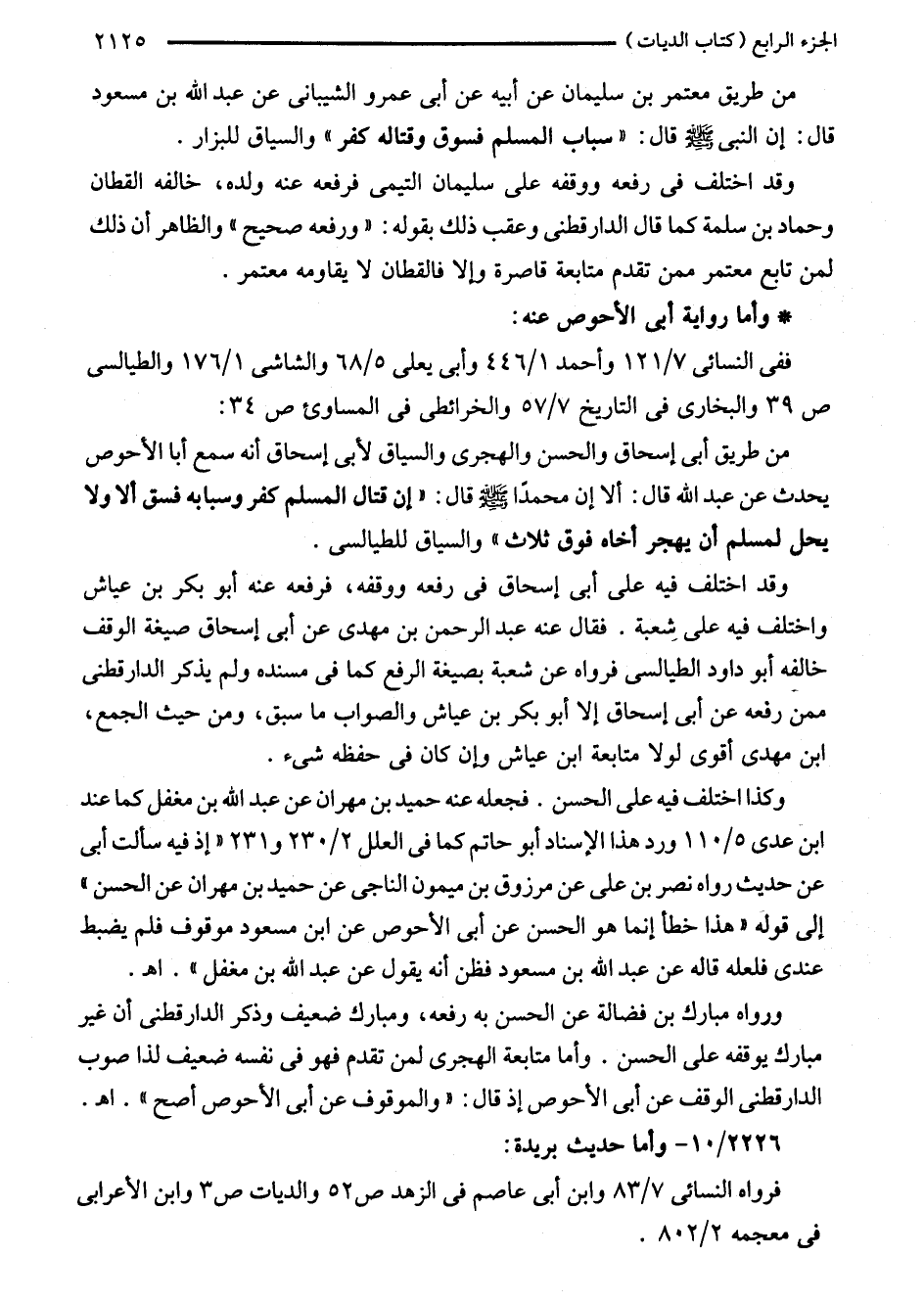 من طريق أبي إسحاق والحسن والهجرى والسياق لأبى إسحاق أنه سمع أبا الأحوص يحدث عن عبد اللَّه قال: ألا إن محمدًا - صلى اللَّه عليه وسلم - قال: "إن قتال المسلم كفر وسبابه فسق ألا ولا يحل لمسلم أن يهجر أخاه فوق ثلاث" والسياق للطيالسى.