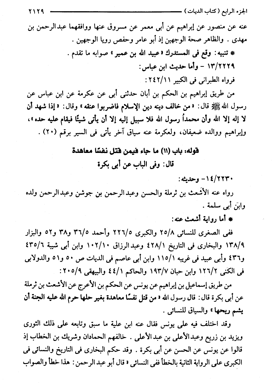 من طريق إسماعيل بن إبراهيم عن يونس عن الحكم بن الأعرج عن الأشعث بن ثرملة عن أبي بكرة قال: قال رسول اللَّه "من قتل نفسًا معاهدة بغير حلها حرم اللَّه عليه الجنة أن يشم ريحها" والسياق للنسائي.