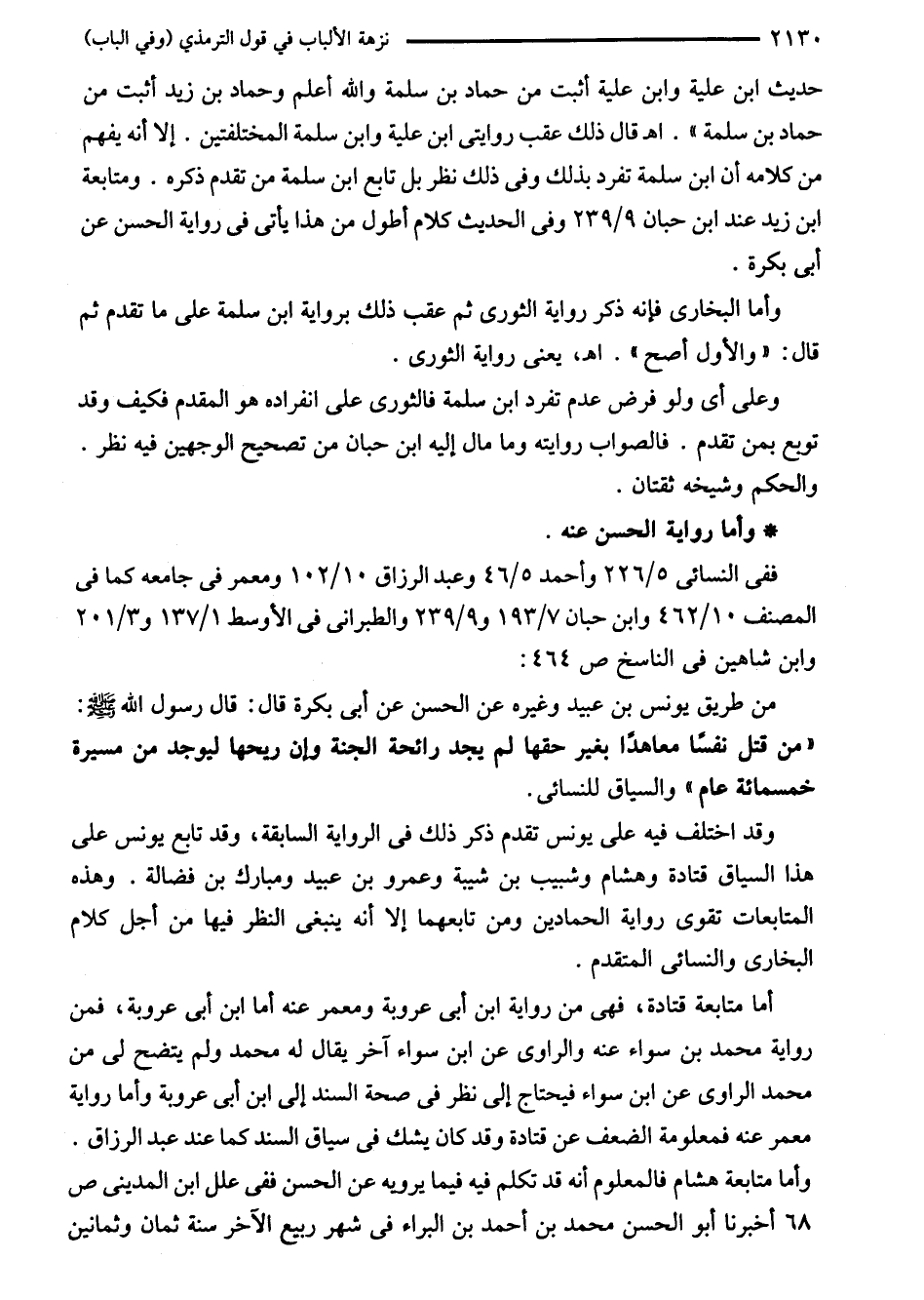 حديث ابن علية وابن علية أثبت من حماد بن سلمة واللَّه أعلم وحماد بن زيد أثبت من حماد بن سلمة". اهـ قال ذلك عقب روايتى ابن علية وابن سلمة المختلفتين. إلا أنه يفهم من كلامه أن ابن سلمة تفرد بذلك وفي ذلك نظر بل تابع ابن سلمة من تقدم ذكره. ومتابعة ابن زيد عند ابن حبان 9/ 239 وفي الحديث كلام أطول من هذا يأتى في رواية الحسن عن أبي بكرة.