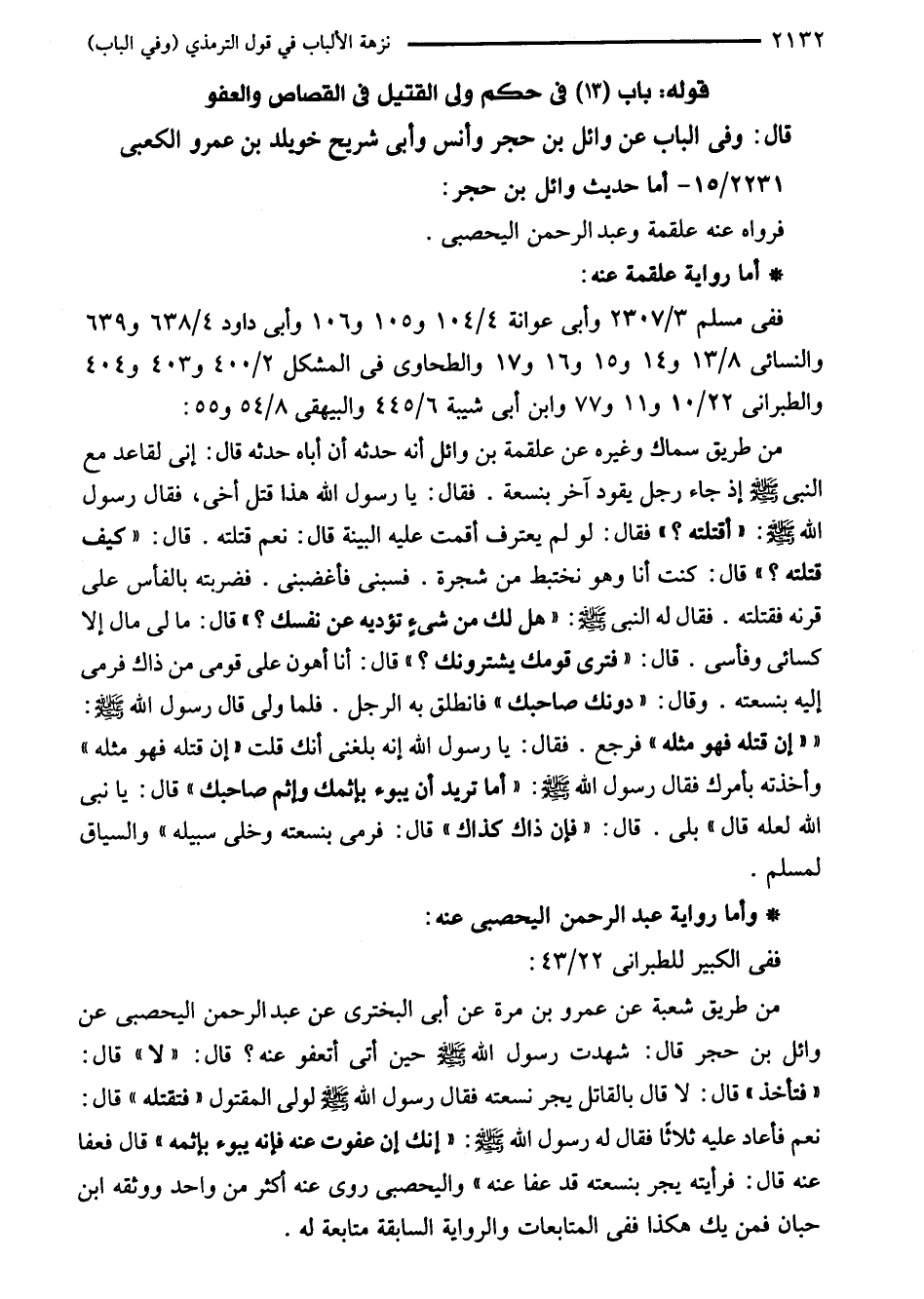 من طريق شعبة عن عمرو بن مرة عن أبي البخترى عن عبد الرحمن اليحصبى عن وائل بن حجر قال: شهدت رسول اللَّه - صلى اللَّه عليه وسلم - حين أتى أتعفو عنه؟ قال: "لا" قال: "فتأخذ" قال: لا قال بالقاتل يجر نسعته فقال رسول اللَّه - صلى اللَّه عليه وسلم - لولى المقتول "فتقتله" قال: نعم فأعاد عليه ثلاثًا فقال له رسول اللَّه - صلى اللَّه عليه وسلم -: "إنك إن عفوت عنه فإنه يبوء بإثمه" قال فعفا عنه قال: فرأيته يجر بنسعته قد عفا عنه" واليحصبى روى عنه أكثر من واحد ووثقه ابن حبان فمن يك هكذا ففي المتابعات والرواية السابقة متابعة له.