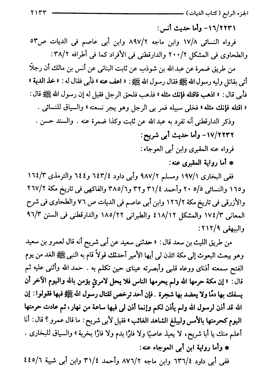 ففي البخاري 1/ 197 ومسلم 2/ 987 وأبي داود 4/ 643 و 644 والترمذي 3/ 164 و 165 والنسائي 5/ 205 وأحمد 4/ 31 و 32 و 6/ 385 والفاكهى في تاريخ مكة 2/ 267 والأزرقى في تاريخ مكة 2/ 126 وابن أبي عاصم في الديات ص 76 والطحاوى في شرح المعانى 3/ 174 والمشكل 12/ 418 والطبراني 22/ 185 والدارقطني في السنن 3/ 96 والبيهقي 9/ 212:
