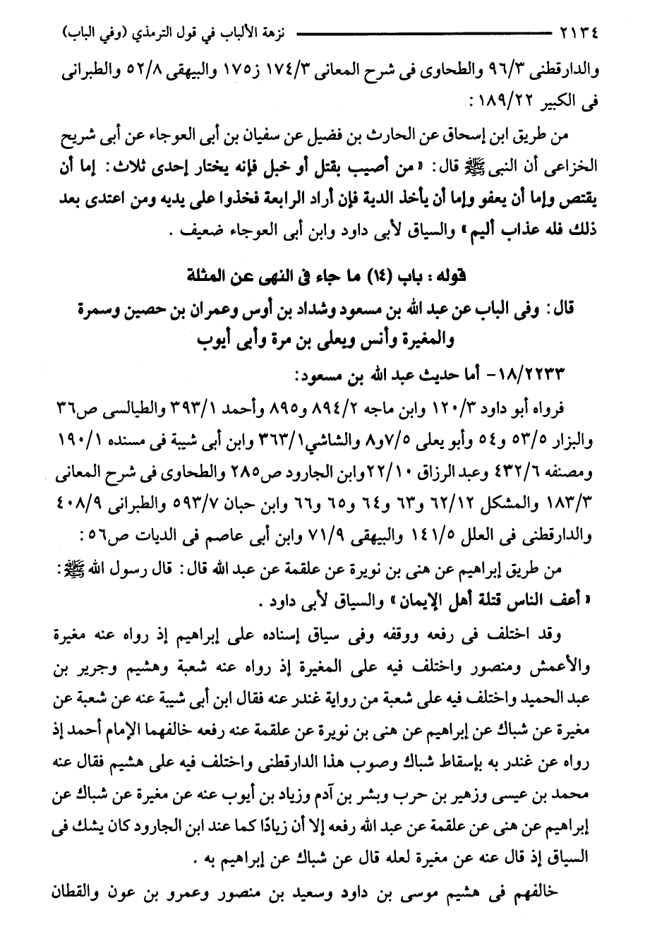 فرواه أبو داود 3/ 120 وابن ماجه 2/ 894 و 895 وأحمد 1/ 393 والطيالسى ص 36 والبزار 5/ 53 و 54 وأبو يعلى 5/ 7 و 8 والشاشي 1/ 363 وابن أبي شيبة في مسنده 1/ 190 ومصنفه 6/ 432 وعبد الرزاق 10/ 22 وابن الجارود ص 285 والطحاوى في شرح المعانى 3/ 183 والمشكل 12/ 62 و 63 و 64 و 65 و 66 وابن حبان 7/ 593 والطبراني 9/ 408 والدارقطني في العلل 5/ 141 والبيهقي 9/ 71 وابن أبي عاصم في الديات ص 56: