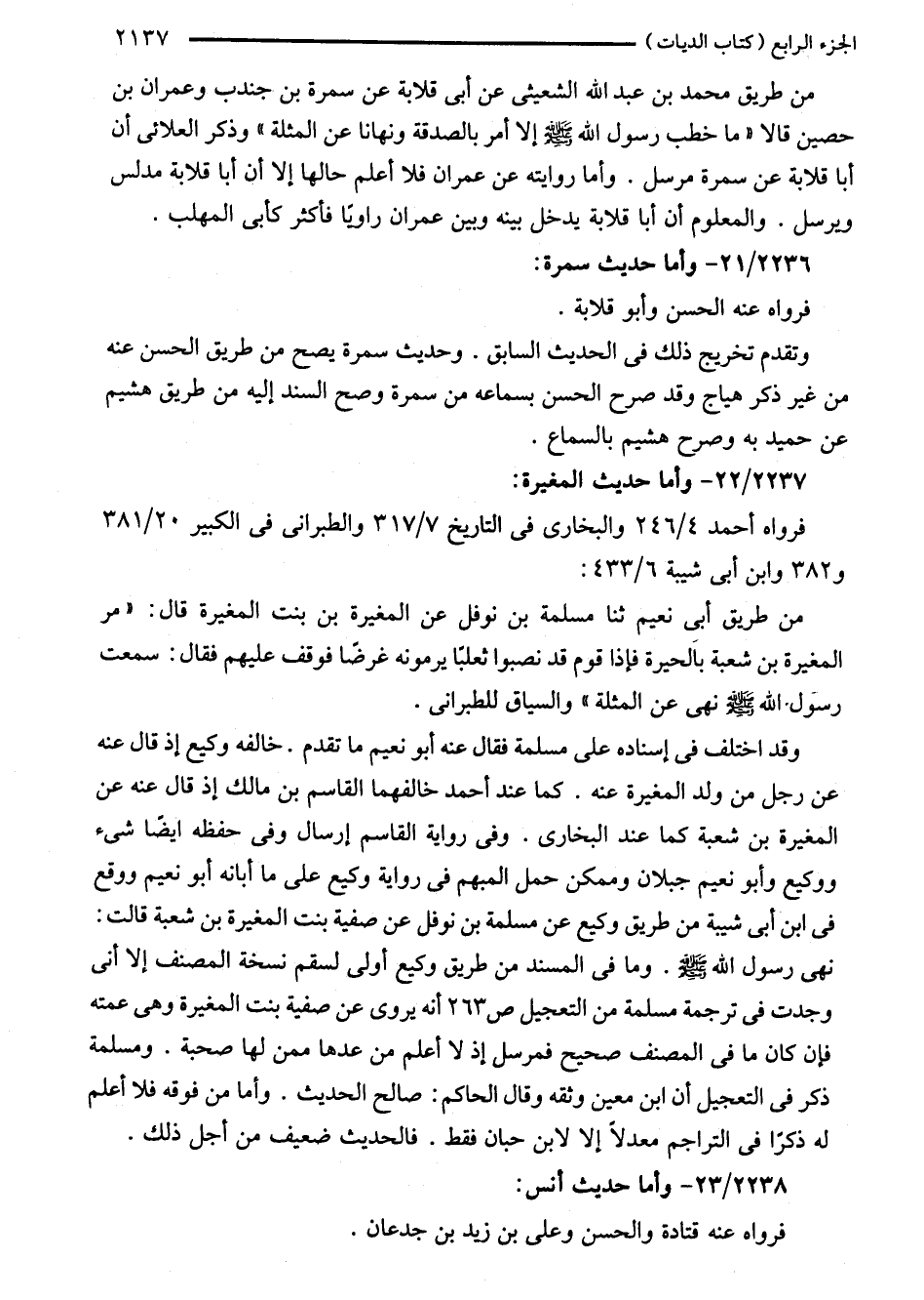 من طريق محمد بن عبد اللَّه الشعيثى عن أبي قلابة عن سمرة بن جندب وعمران بن حصين قالا "ما خطب رسول اللَّه - صلى اللَّه عليه وسلم - إلا أمر بالصدقة ونهانا عن المثلة" وذكر العلائى أن أبا قلابة عن سمرة مرسل. وأما روايته عن عمران فلا أعلم حالها إلا أن أبا قلابة مدلس ويرسل. والمعلوم أن أبا قلابة يدخل بينه وبين عمران راويا فأكثر كأبى المهلب.