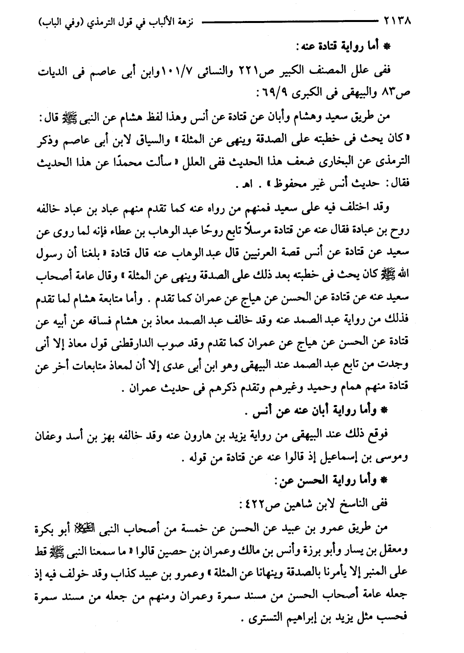 من طريق سعيد وهشام وأبان عن قتادة عن أنس وهذا لفظ هشام عن النبي - صلى اللَّه عليه وسلم - قال: "كان يحث في خطبته على الصدقة وينهى عن المثلة" والسياق لابن أبي عاصم وذكر الترمذي عن البخاري ضعف هذا الحديث ففي العلل "سألت محمدًا عن هذا الحديث فقال: حديث أنس غير محفوظ". اهـ.