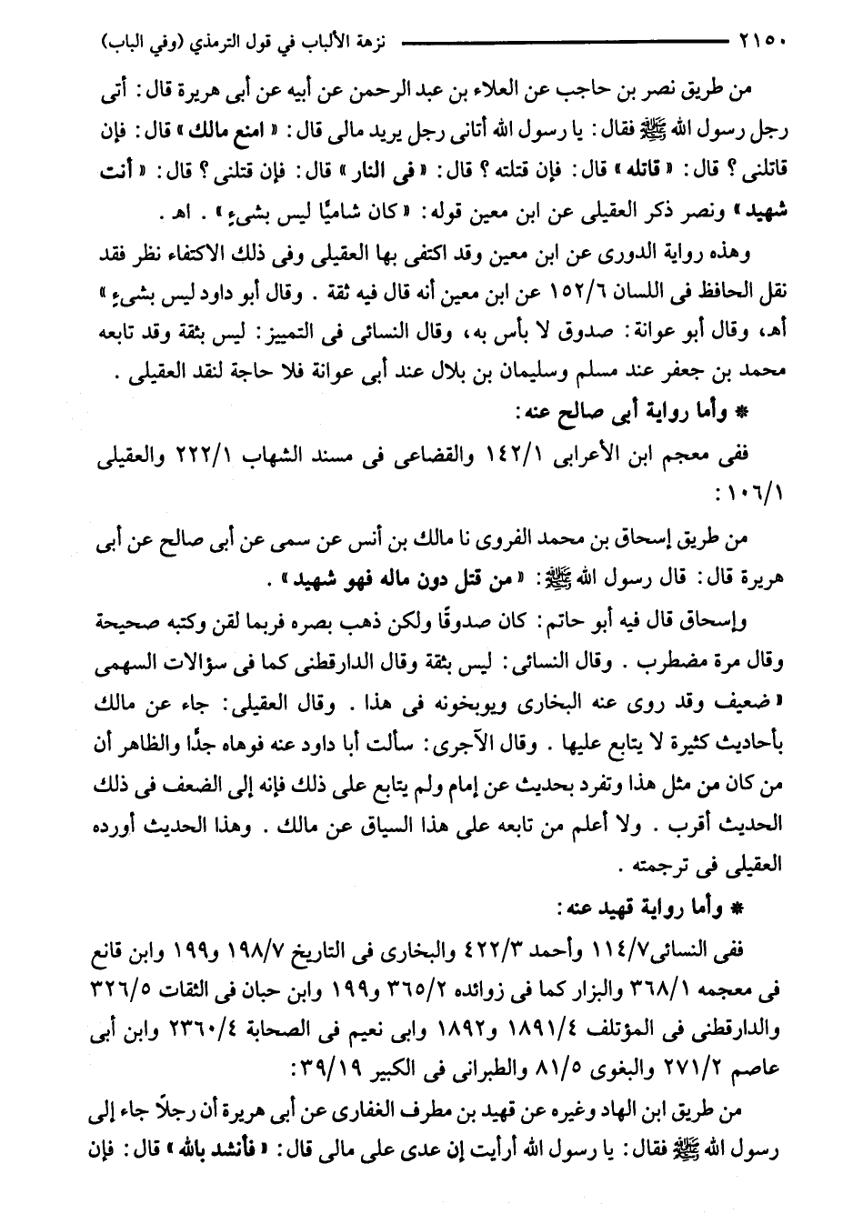 من طريق نصر بن حاجب عن العلاء بن عبد الرحمن عن أبيه عن أبي هريرة قال: أتى رجل رسول اللَّه - صلى اللَّه عليه وسلم - فقال: يا رسول اللَّه أتانى رجل يريد مالى قال: "امنع مالك" قال: فإن قاتلنى؟ قال: "قاتله" قال: فإن قتلته؟ قال: "في النار" قال: فإن قتلنى؟ قال: "أنت شهيد" ونصر ذكر العقيلى عن ابن معين قوله: "كان شاميًا ليس بشىء". اهـ.