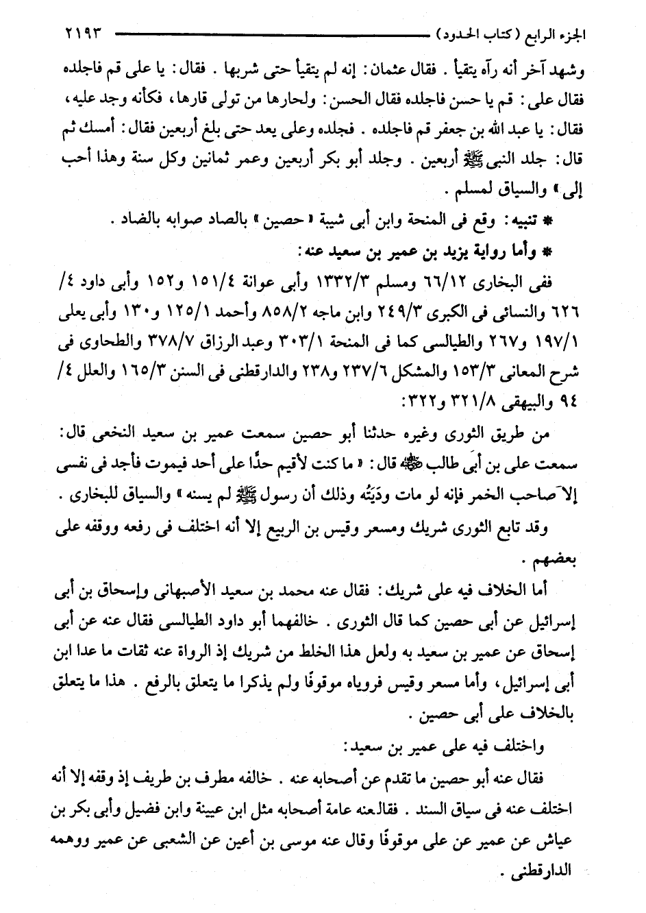 وشهد آخر أنه رآه يتقيأ. فقال عثمان: إنه لم يتقيأ حتى شربها. فقال: يا على قم فاجلده فقال على: قم يا حسن فاجلده فقال الحسن: ولحارها من تولى قارها، فكأنه وجد عليه، فقال: يا عبد اللَّه بن جعفر قم فاجلده. فجلده وعلى يعد حتى بلغ أربعين فقال: أمسك ثم قال: جلد النبي - صلى اللَّه عليه وسلم - أربعين. وجلد أبو بكر أربعين وعمر ثمانين وكل سنة وهذا أحب إلى" والسياق لمسلم.