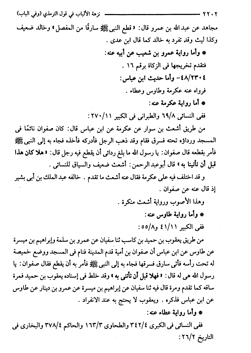 من طريق أشعث بن سوار عن عكرمة عن ابن عباس قال: كان صفوان نائمًا في المسجد ورداؤه تحته فسرق فقام وقد ذهب الرجل فأدركه فأخذه فجاء به إلى النبي - صلى اللَّه عليه وسلم - فأمر بقطعه قال صفوان: يا رسول اللَّه ما بلغ ردائى أن يقطع فيه رجل قال: "هلا كان هذا قبل أن تأتينا به" قال أبو عبد الرحمن: أشعث ضعيف والسياق للنسائي.
