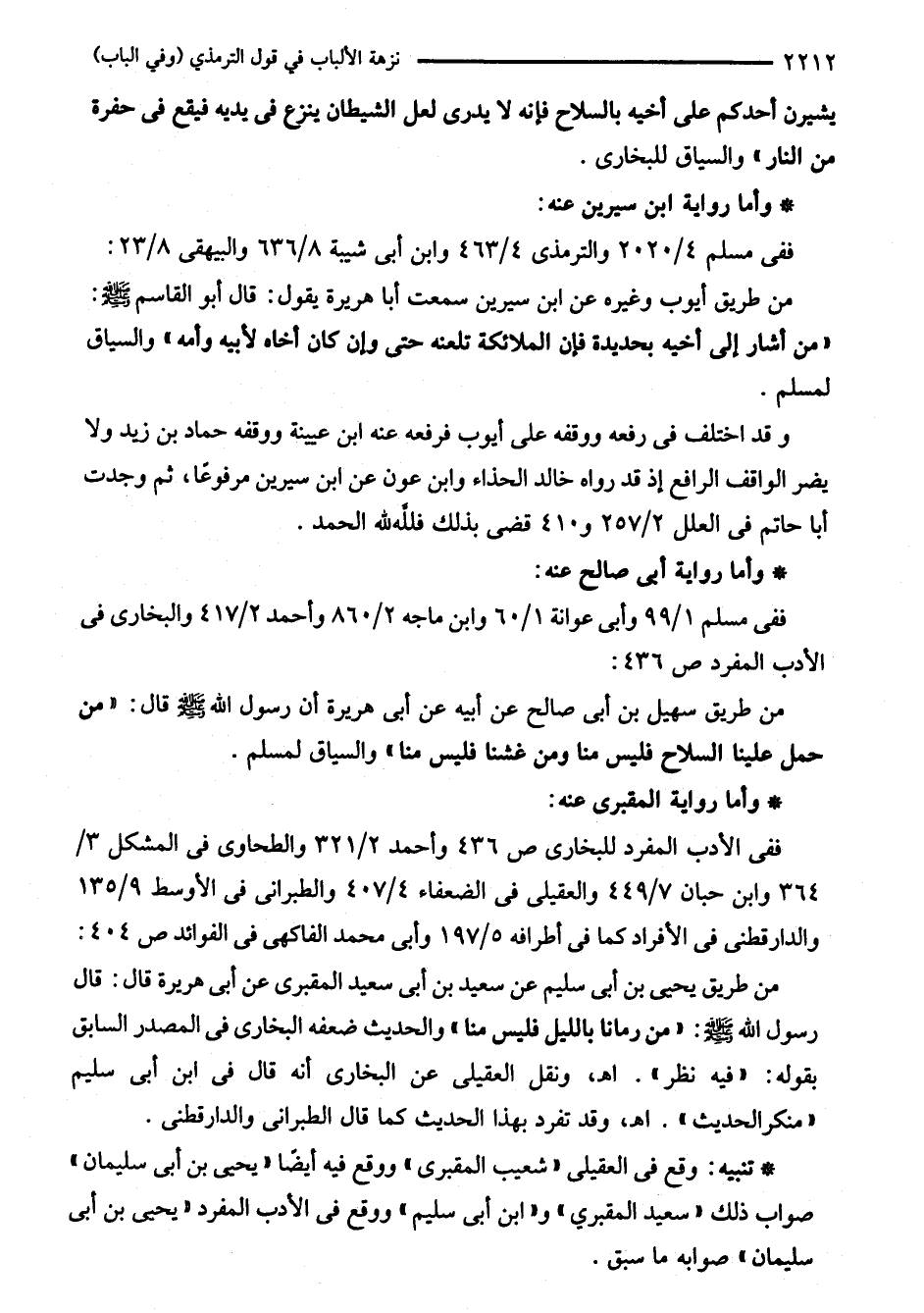 من طريق أيوب وغيره عن ابن سيرين سمعت أبا هريرة يقول: قال أبو القاسم - صلى اللَّه عليه وسلم -: "من أشار الى أخيه بحديدة فإن الملائكة تلعنه حتى وإن كان أخاه لأبيه وأمه" والسياق لمسلم.