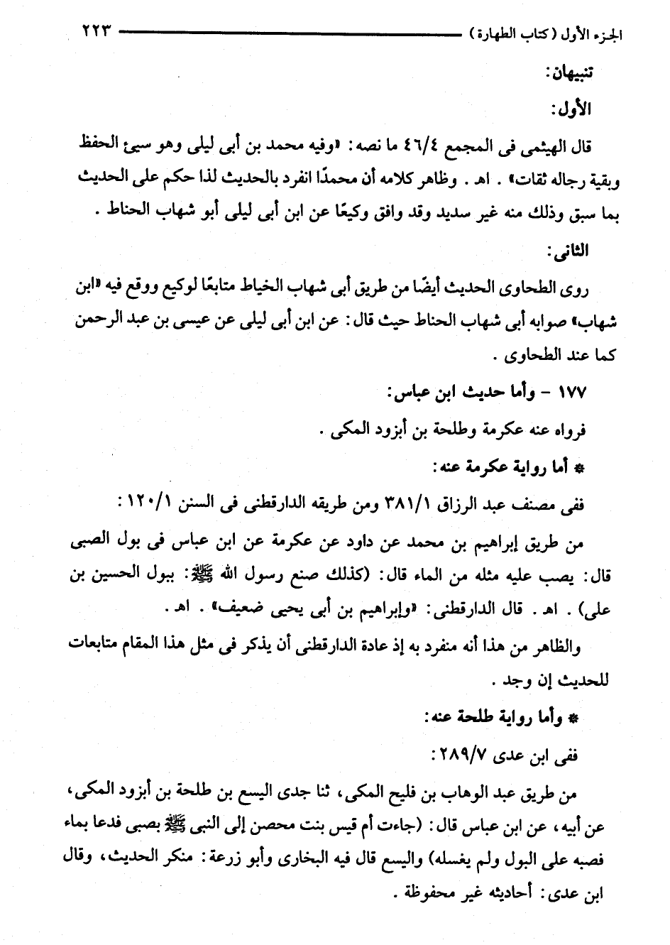 من طريق إبراهيم بن محمد عن داود عن عكرمة عن ابن عباس في بول الصبي قال: يصب عليه مثله من الماء قال: (كذلك صنع رسول الله - صلى الله عليه وسلم -: ببول الحسين بن على). اهـ. قال الدارقطني: "وإبراهيم بن أبى يحيى ضعيف". اهـ.