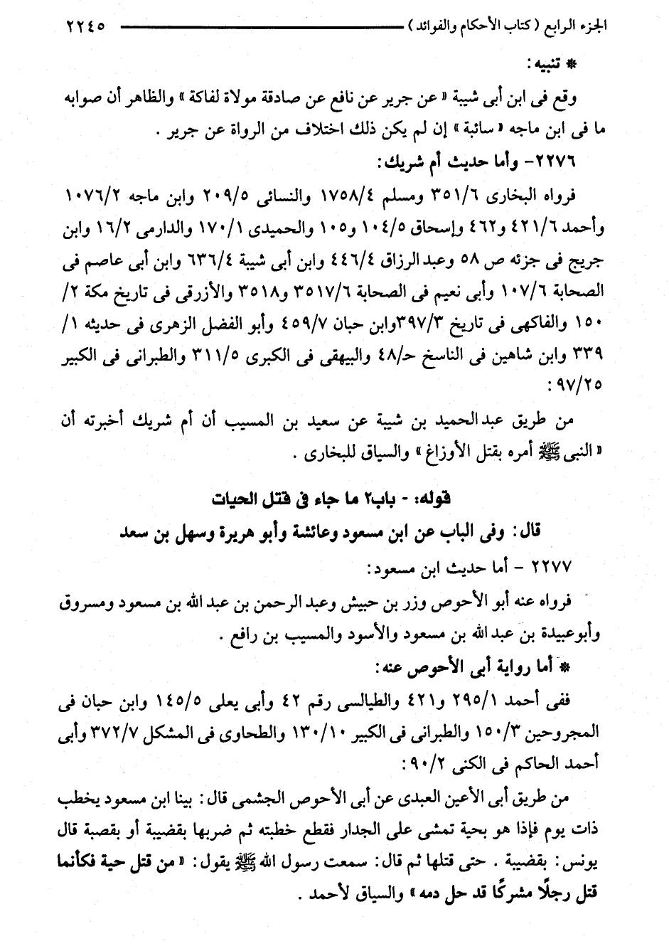 من طريق أبي الأعين العبدى عن أبي الأحوص الجشمى قال: بينا ابن مسعود يخطب ذات يوم فإذا هو بحية تمشى على الجدار فقطع خطبته ثم ضربها بقضيبة أو بقصبة قال يونس: بقضيبة. حتى قتلها ثم قال: سمعت رسول اللَّه - صلى اللَّه عليه وسلم - يقول: "من قتل حية فكأنما قتل رجلًا مشركًا قد حل دمه" والسياق لأحمد.