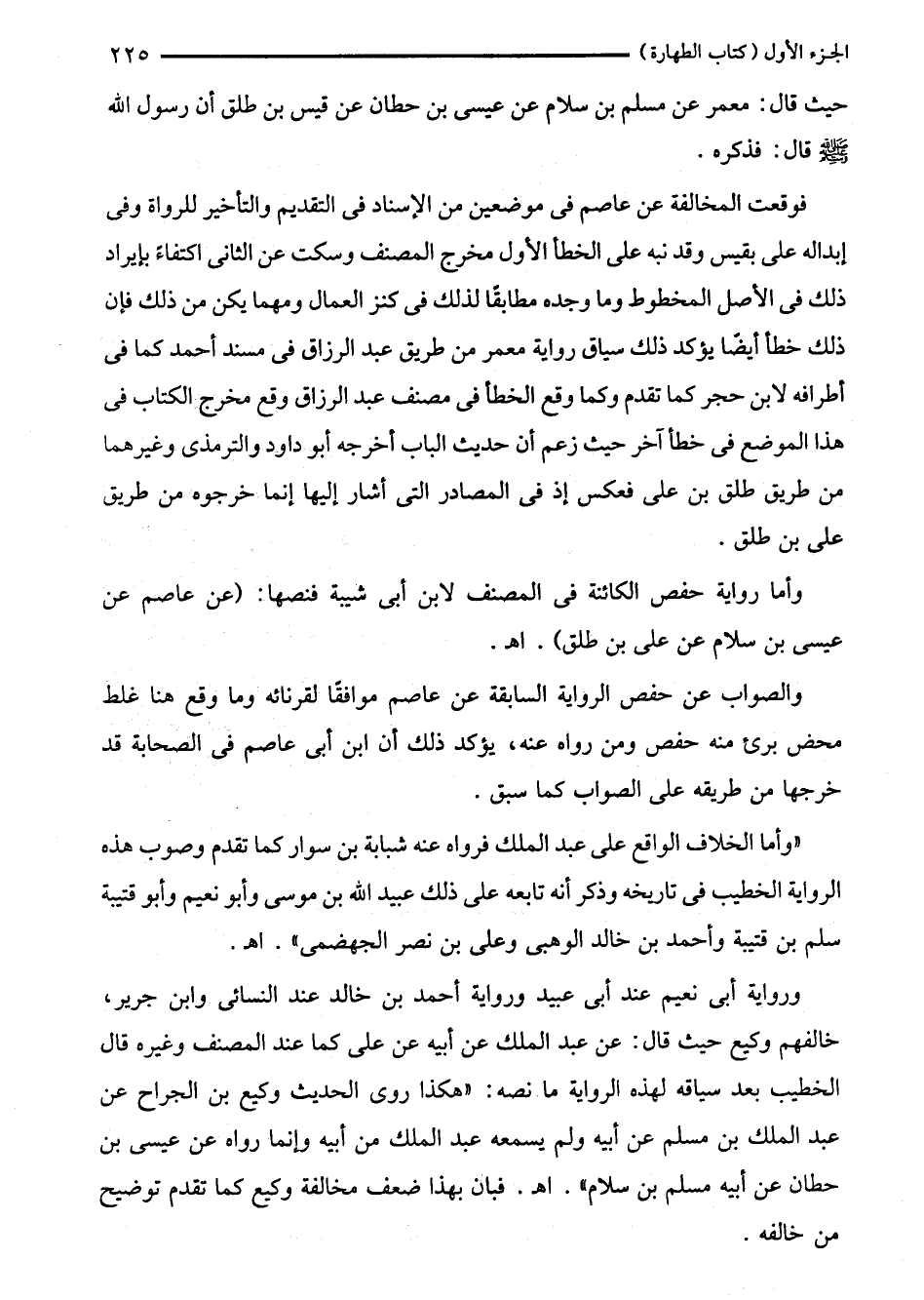 فوقعت المخالفة عن عاصم في موضعين من الإسناد في التقديم والتأخير للرواة وفى إبداله على بقيس وقد نبه على الخطأ الأول مخرج المصنف وسكت عن الثانى اكتفاءً بإيراد ذلك في الأصل المخطوط رما وجده مطابقًا لذلك في كنز العمال ومهما يكن من ذلك فإن ذلك خطأ أيضًا يؤكد ذلك سياق رواية معمر من طريق عبد الرزاق في مسند أحمد كما في أطرافه لابن حجر كما تقدم وكما وقع الخطأ في مصنف عبد الرزاق وقع مخرج الكتاب في هذا الموضع في خطأ آخر حيث زعم أن حديث الباب أخرجه أبو داود والترمذي وغيرهما من طريق طلق بن على فعكس إذ في المصادر التى أشار إليها إنما خرجوه من طريق على بن طلق.