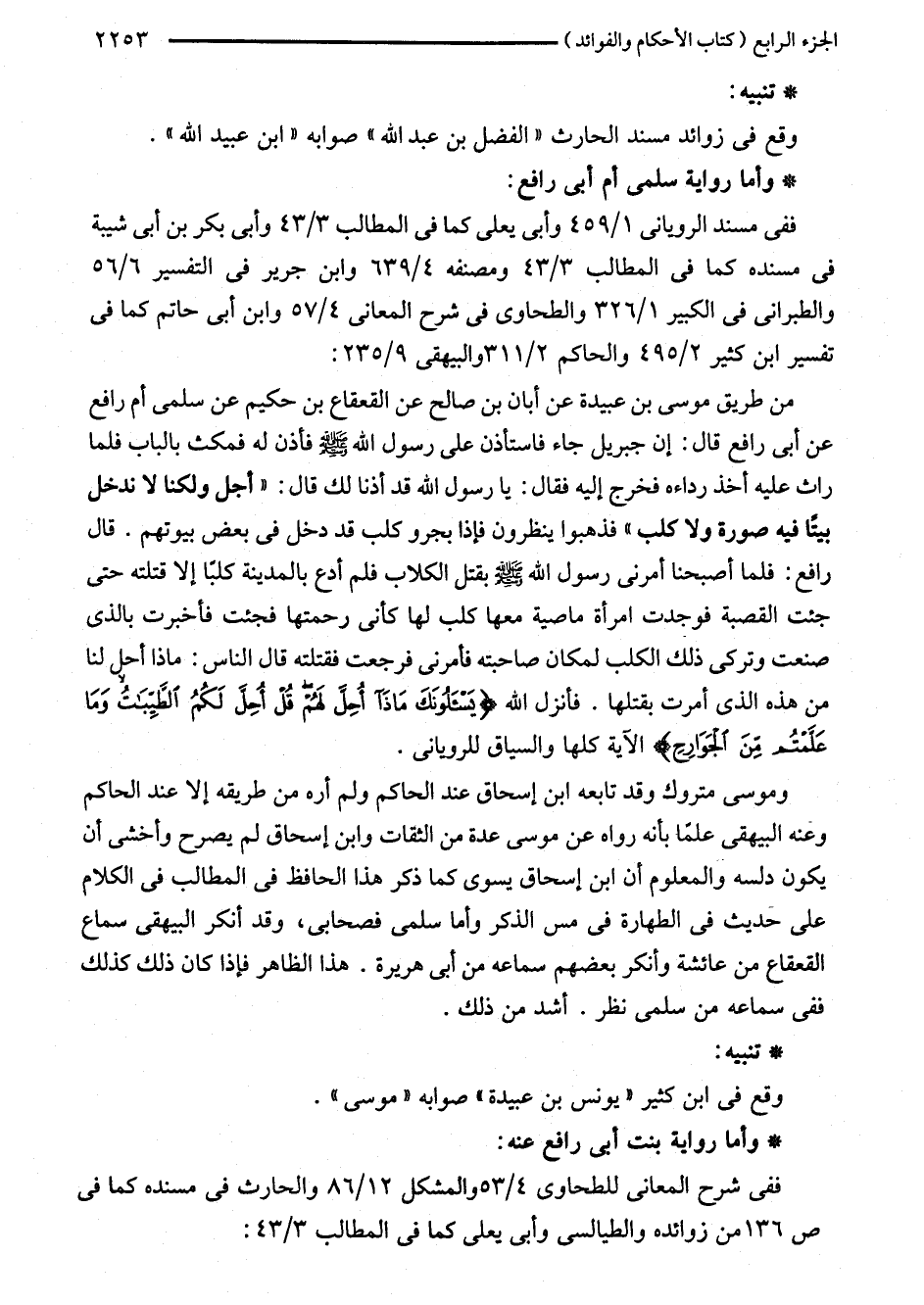 من طريق موسى بن عبيدة عن أبان بن صالح عن القعقاع بن حكيم عن سلمى أم رافع عن أبي رافع قال: إن جبريل جاء فاستأذن على رسول اللَّه - صلى اللَّه عليه وسلم - فأذن له فمكث بالباب فلما راث عليه أخذ رداءه فخرج إليه فقال: يا رسول اللَّه قد أذنا لك قال: "أجل ولكنا لا ندخل بيتًا فيه صورة ولا كلب" فذهبوا ينظرون فإذا بجرو كلب قد دخل في بعض بيوتهم. قال رافع: فلما أصبحنا أمرنى رسول اللَّه - صلى اللَّه عليه وسلم - بقتل الكلاب فلم أدع بالمدينة كلبًا إلا قتلته حتى جئت القصبة فوجدت امرأة ماصية معها كلب لها كأنى رحمتها فجئت فأخبرت بالذى صنعت وتركى ذلك الكلب لمكان صاحبته فأمرنى فرجعت فقتلته قال الناس: ماذا أحل لنا من هذه الذى أمرت بقتلها. فانزل اللَّه {يَسْأَلُونَكَ مَاذَا أُحِلَّ لَهُمْ قُلْ أُحِلَّ لَكُمُ الطَّيِّبَاتُ وَمَا عَلَّمْتُمْ مِنَ الْجَوَارِحِ} الآية كلها والسياق للرويانى.