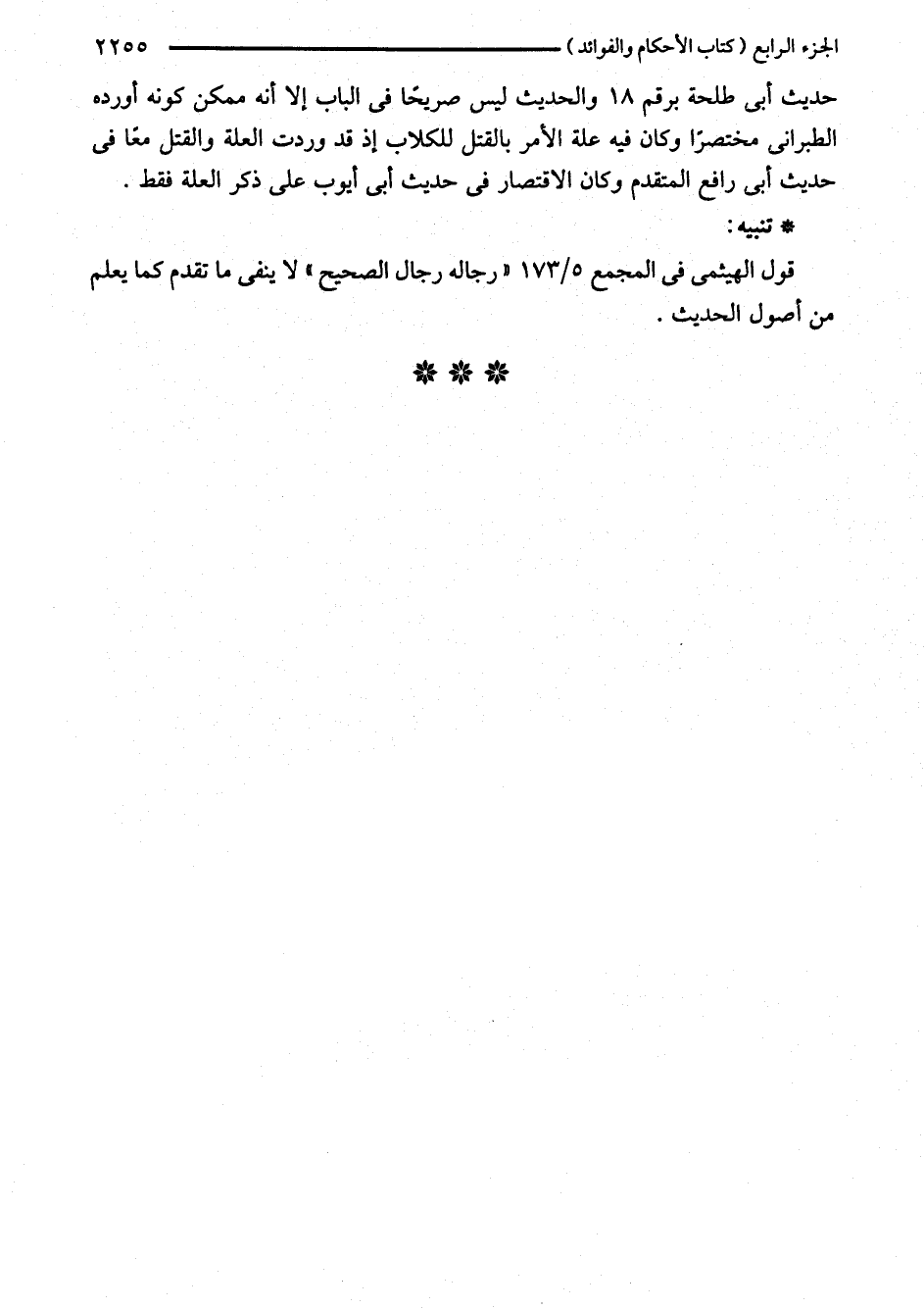 حديث أبي طلحة برقم 18 والحديث ليس صريحًا في الباب إلا أنه ممكن كونه أورده الطبراني مختصرًا وكان فيه علة الأمر بالقتل للكلاب إذ قد وردت العلة والقتل معًا في حديث أبي رافع المتقدم وكان الاقتصار في حديث أبي أيوب على ذكر العلة فقط.