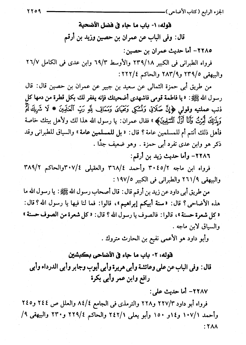 من طريق أبي داود عن زيد بن أرقم قال: قال أصحاب رسول اللَّه - صلى اللَّه عليه وسلم -: يا رسول اللَّه ما هذه الأضاحى؟ قال: "سنة أبيكم إبراهيم"، قالوا: فما لنا فيها يا رسول اللَّه؟ قال: "بكل شعرة حسنة"، قالوا: فالصوف يا رسول اللَّه؟ قال: "كل شعرة من الصوف حسنة" والسياق لابن ماجه.