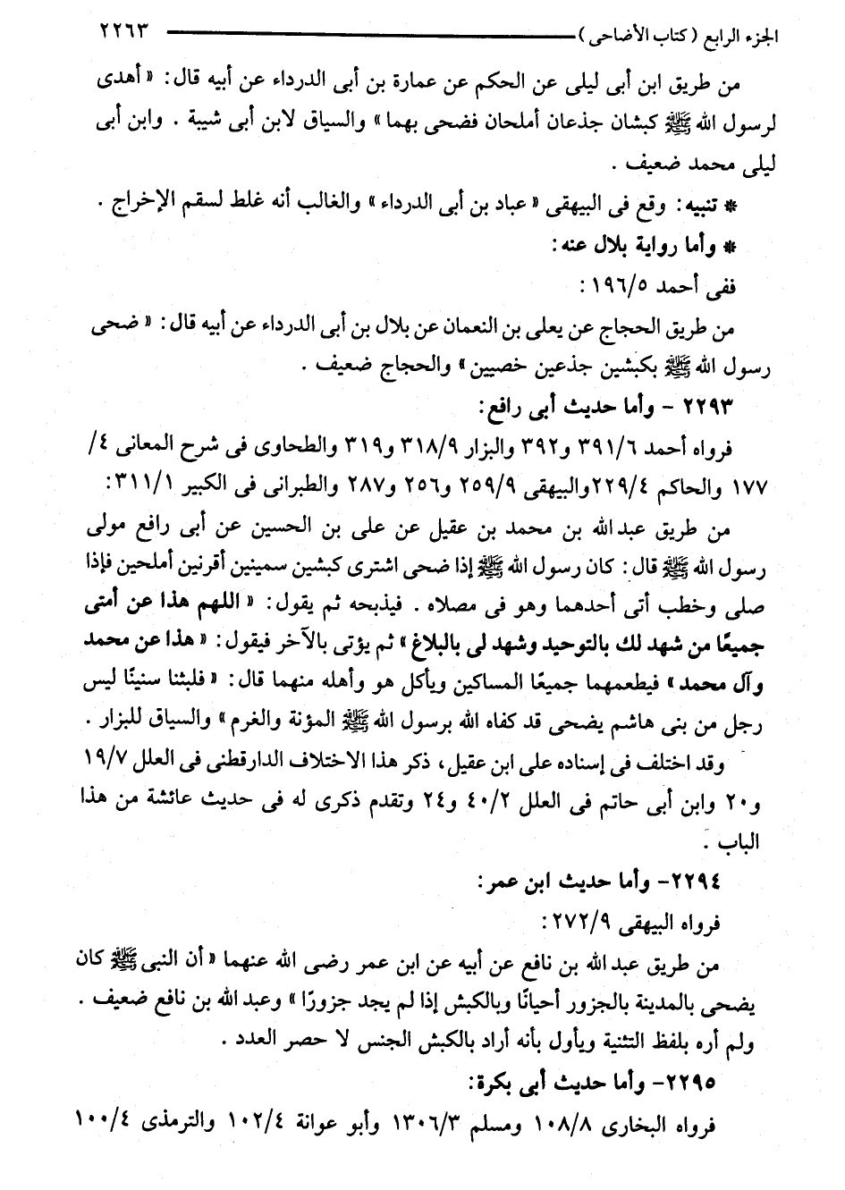 من طريق عبد اللَّه بن محمد بن عقيل عن على بن الحسين عن أبي رافع مولى رسول اللَّه - صلى اللَّه عليه وسلم - قال: كان رسول اللَّه - صلى اللَّه عليه وسلم - إذا ضحى اشترى كبشين سمينين أقرنين أملحين فإذا صلى وخطب أتى أحدهما وهو في مصلاه. فيذبحه ثم يقول: "اللهم هذا عن أمتى جميعًا من شهد لك بالتوحيد وشهد لى بالبلاغ" ثم يؤتى بالآخر فيقول: "هذا عن محمد وآل محمد، فيطعمهما جميعًا المساكين ويأكل هو وأهله منهما قال: "فلبثنا سنينًا ليس رجل من بنى هاشم يضحى قد كفاه اللَّه برسول اللَّه - صلى اللَّه عليه وسلم - المؤنة والغرم" والسياق للبزار.