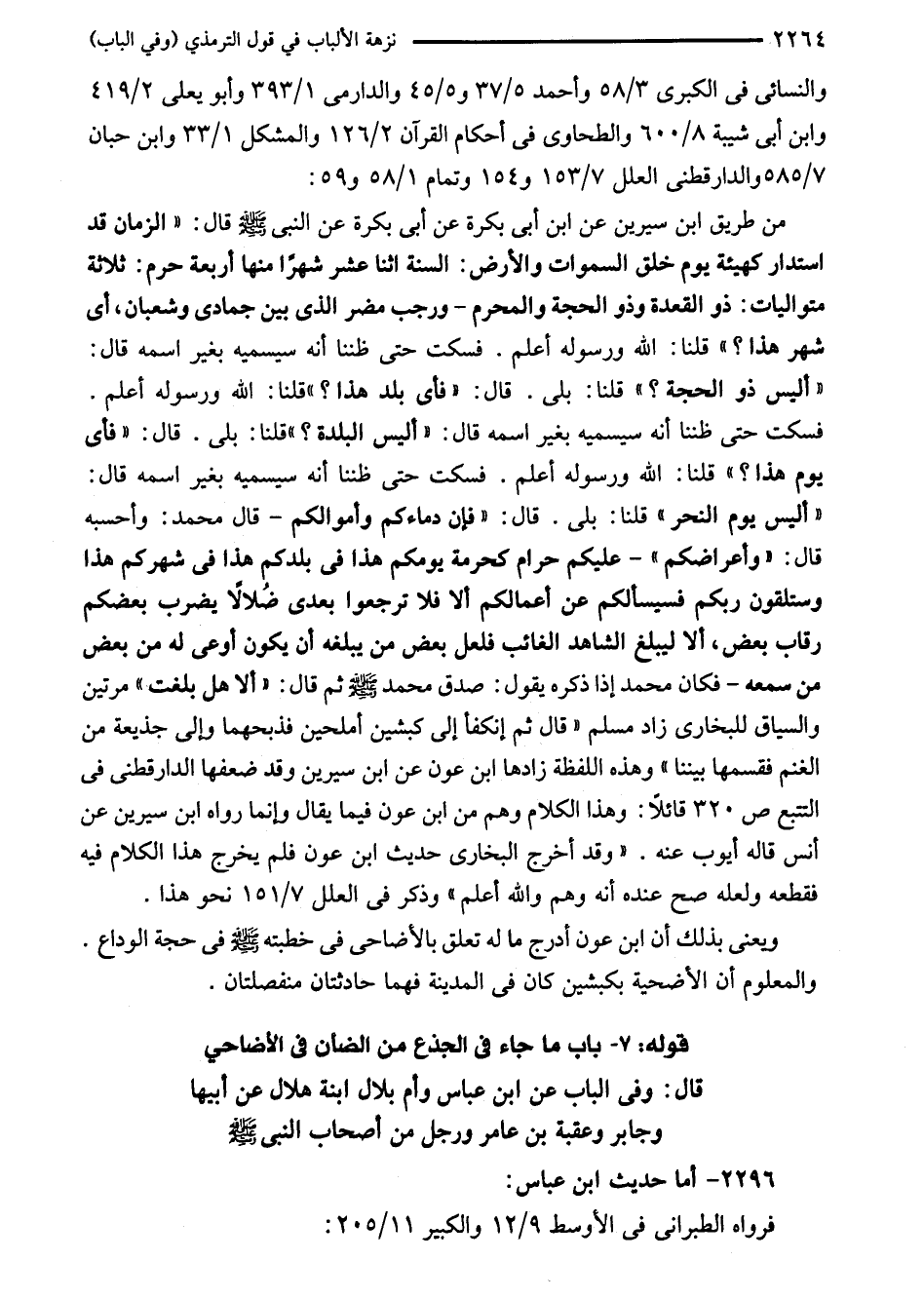 من طريق ابن سيرين عن ابن أبي بكرة عن أبي بكرة عن النبي - صلى اللَّه عليه وسلم - قال: "الزمان قد استدار كهيئة يوم خلق السموات والأرض: السنة اثنا عشر شهرًا منها أربعة حرم: ثلاثة متواليات: ذو القعدة وذو الحجة والمحرم - ورجب مضر الذى بين جمادى وشعبان، أي شهر هذا؟ " قلنا: اللَّه ورسوله أعلم. فسكت حتى ظننا أنه سيسميه بغير اسمه قال: "أليس ذو الحجة؟ " قلنا: بلى. قال: "فأى بلد هذا؟ " قلنا: اللَّه ورسوله أعلم. فسكت حتى ظننا أنه سيسميه بغير اسمه قال: "أليس البلدة؟ " قلنا: بلى. قال: "فأى يوم هذا؟ " قلنا: اللَّه ورسوله أعلم. فسكت حتى ظننا أنه سيسميه بغير اسمه قال: "أليس يوم النحر" قلنا: بلى. قال: "فإن دماءكم وأموالكم -قال محمد: وأحسبه قال: "وأعراضكم"- عليكم حرام كحرمة يومكم هذا في بلدكم هذا في شهركم هذا وستلقون ربكم فسيسألكم عن أعمالكم ألا فلا ترجعوا بعدى ضُلالًا يضرب بعضكم رقاب بعض، ألا ليبلغ الشاهد الغائب فلعل بعض من يبلغه أن يكون أوعى له من بعض من سمعه - فكان محمد إذا ذكره يقول: صدق محمد - صلى اللَّه عليه وسلم - ثم قال: "ألا هل بلغت" مرتين والسياق للبخاري زاد مسلم "قال ثم إنكفأ إلى كبشين أملحين فذبحهما وإلى جذيعة من الغنم فقسمها بيننا" وهذه اللفظة زادها ابن عون عن ابن سيرين وقد ضعفها الدارقطني في التتبع ص 320 قائلًا: وهذا الكلام وهم من ابن عون فيما يقال وإنما رواه ابن سيرين عن أنس قاله أيوب عنه. "وقد أخرج البخاري حديث ابن عون فلم يخرج هذا الكلام فيه فقطعه ولعله صح عنده أنه وهم واللَّه أعلم" وذكر في العلل 7/ 151 نحو هذا.