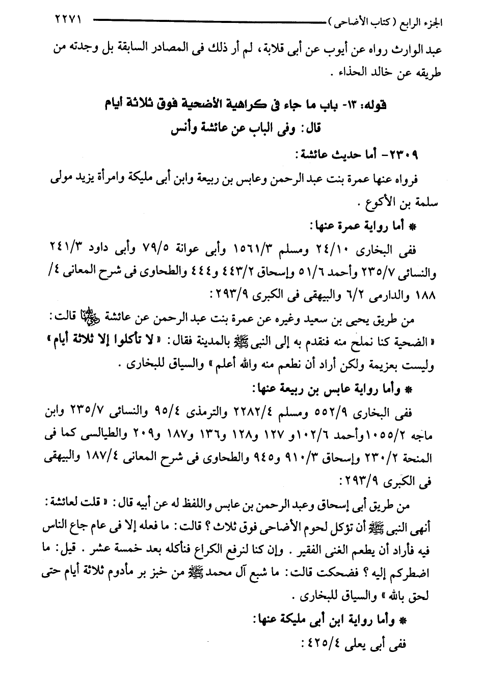 من طريق يحيى بن سعيد وغيره عن عمرة بنت عبد الرحمن عن عاثشة -رضي اللَّه عنها- قالت: "الضحية كنا نملح منه فنقدم به إلى النبي - صلى اللَّه عليه وسلم - بالمدينة فقال: "لا تأكلوا إلا ثلاثة أيام" وليست بعزيمة ولكن أراد أن نطعم منه واللَّه أعلم" والسياق للبخاري.