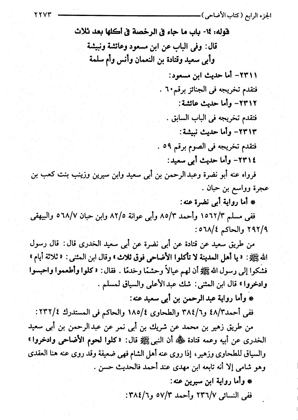 من طريق سعيد عن قتادة عن أبي نضرة عن أبي سعيد الخدرى قال: قال رسول اللَّه - صلى اللَّه عليه وسلم -: "يا أهل المدينة لا تأكلوا الأضاحى فوق ثلاث" وقال ابن المثنى: "ثلاثة أيام" فشكوا إلى رسول اللَّه - صلى اللَّه عليه وسلم - أن لهم عيالًا وحشمًا وخدمًا. فقال: "كلوا وأطعموا واحبسوا وادخروا" قال ابن المثنى: شك عبد الأعلى والسياق لمسلم.