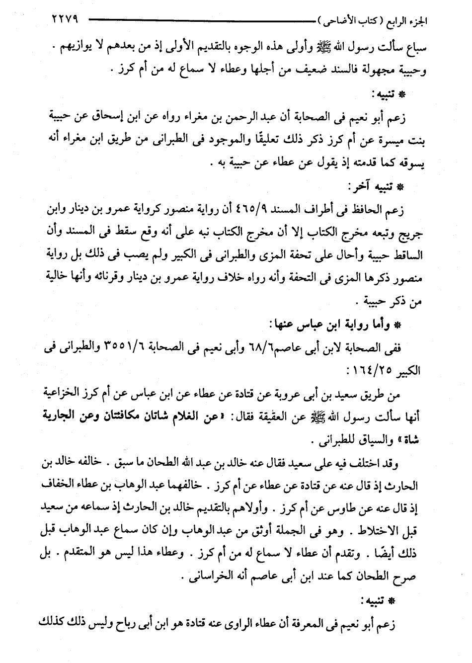 سباع سألت رسول اللَّه - صلى اللَّه عليه وسلم - وأولى هذه الوجوه بالتقديم الأولى إذ من بعدهم لا يوازيهم. وحبيبة مجهولة فالسند ضعيف من أجلها وعطاء لا سماع له من أم كرز.