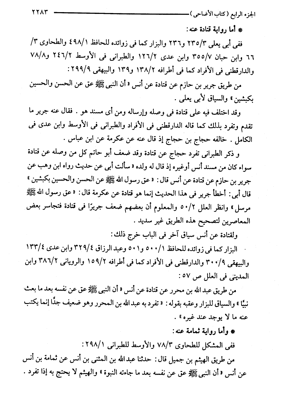 وذكر الطبراني تفرد حجاج عن قتادة وقد ضعف أبو حاتم كل من وصله عن قتادة سواء كان من مسند أنس أوغيره إذ قال له ولده "سألت أبي عن حديث رواه ابن وهب عن جرير بن حازم عن قتادة عن أنس قال: "عق رسول اللَّه - صلى اللَّه عليه وسلم - عن الحسن والحسين بكبشين" قال أبي: أخطأ جرير في هذا الحديث إنما هو قتادة عن عكرمة قال: "عق رسول اللَّه - صلى اللَّه عليه وسلم - مرسل" وانظر العلل 2/ 50 والمعلوم أن بعضهم ضعف جريرًا في قتادة فتجاسر بعض المعاصرين لتصحيح هذه الطريق غير سديد.