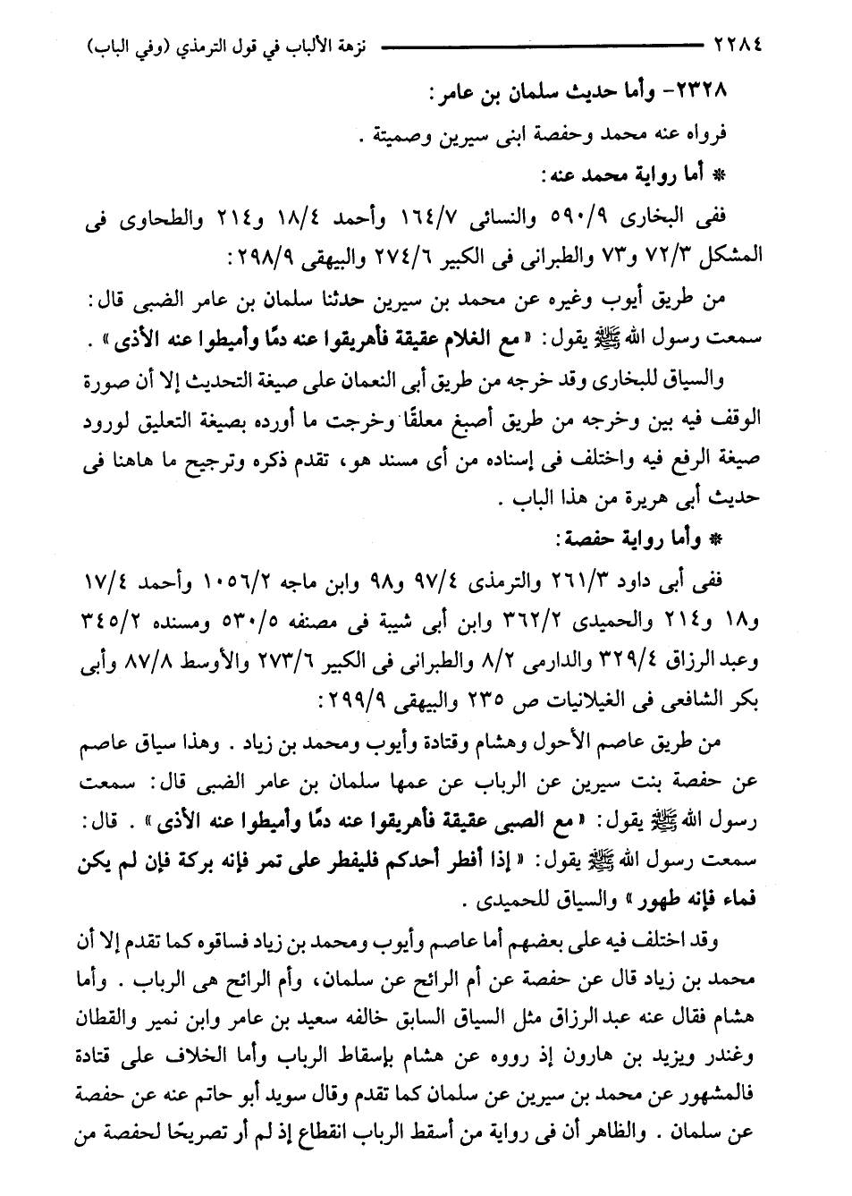 من طريق أيوب وغيره عن محمد بن سيرين حدثنا سلمان بن عامر الضبى قال: سمعت رسول اللَّه - صلى اللَّه عليه وسلم - يقول: "مع الغلام عقيقة فأهريقوا عنه دمًا وأميطوا عنه الأذى".