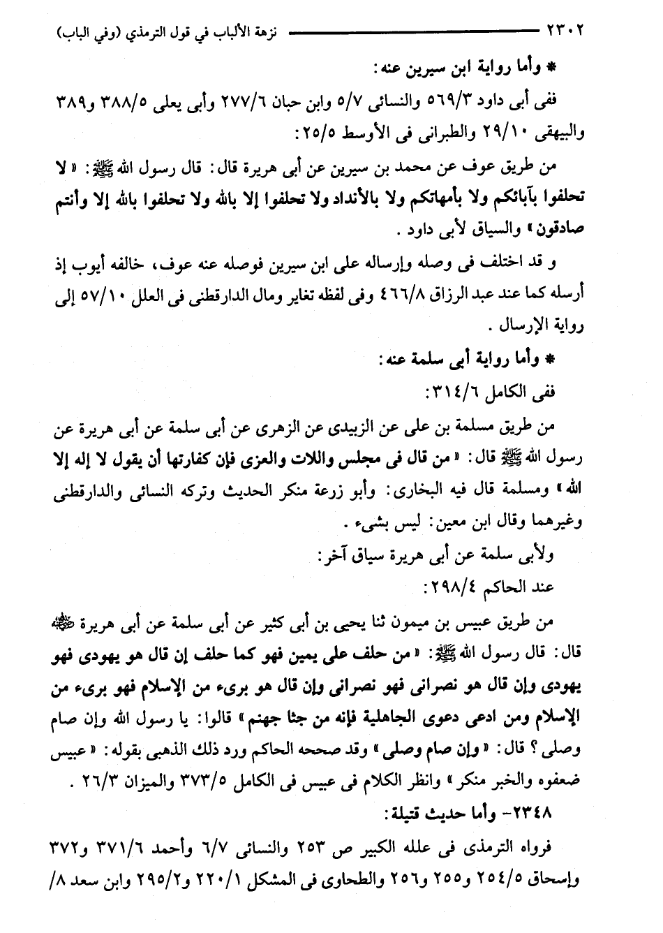 من طريق عوف عن محمد بن سيرين عن أبي هريرة قال: قال رسول اللَّه - صلى اللَّه عليه وسلم -: "لا تحلفوا بآبائكم ولا بأمهاتكم ولا بالأنداد ولا تحلفوا إلا باللَّه ولا تحلفوا باللَّه إلا وأنتم صادقون" والسياق لأبى داود.