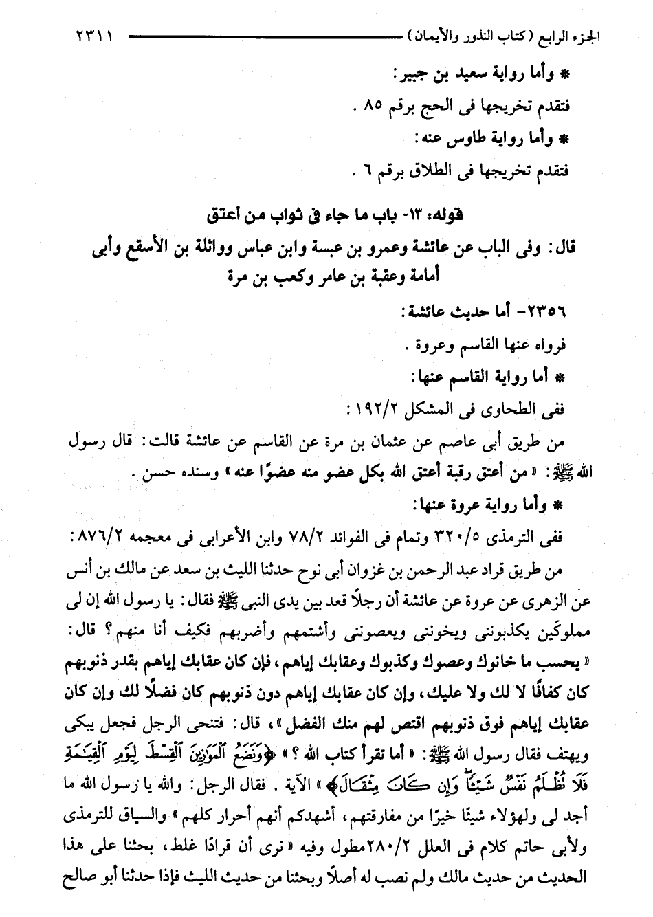 من طريق قراد عبد الرحمن بن غزوان أبي نوح حدثنا الليث بن سعد عن مالك بن أنس عن الزهرى عن عروة عن عائشة أن رجلًا قعد بين يدى النبي - صلى اللَّه عليه وسلم - فقال: يا رسول اللَّه إن لى مملوكَين يكذبوننى ويخوننى ويعصوننى وأشتمهم وأضربهم فكيف أنا منهم؟ قال: "يحسب ما خانوك وعصوك وكذبوك وعقابك إياهم، فإن كان عقابك إياهم بقدر ذنوبهم كان كفافًا لا لك ولا عليك، وإن كان عقابك إياهم دون ذنوبهم كان فضلًا لك وإن كان عقابك إياهم فوق ذنوبهم اقتص لهم منك الفضل"، قال: فتنحى الرجل فجعل يبكى ويهتف فقال رسول اللَّه - صلى اللَّه عليه وسلم -: "أما تقرأ كتاب اللَّه؟ " {وَنَضَعُ الْمَوَازِينَ الْقِسْطَ لِيَوْمِ الْقِيَامَةِ فَلَا تُظْلَمُ نَفْسٌ شَيْئًا وَإِنْ كَانَ مِثْقَالَ} " الآية. فقال الرجل: واللَّه يا رسول اللَّه ما أجد لى ولهؤلاء شيئًا خيرًا من مفارقتهم، أشهدكم أنهم أحرار كلهم" والسياق للترمذي ولأبى حاتم كلام في العلل 2/ 280 مطول وفيه "نرى أن قرادًا غلط، بحثنا على هذا الحديث من حديث مالك ولم نصب له أصلًا وبحثنا من حديث الليث فإذا حدثنا أبو صالح