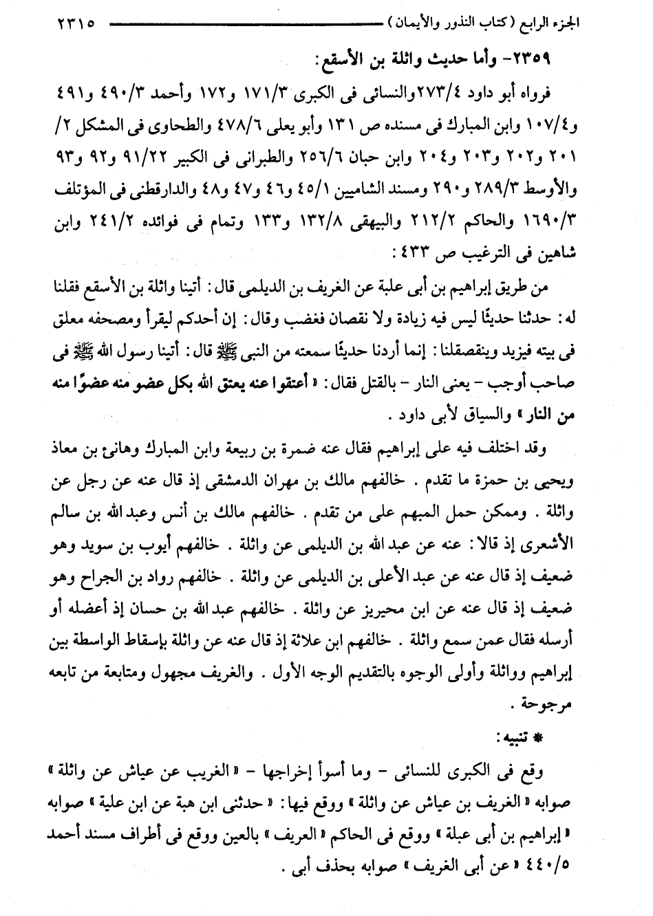 من طريق إبراهيم بن أبي علبة عن الغريف بن الديلمى قال: أتينا واثلة بن الأسقع فقلنا له: حدثنا حديثًا ليس فيه زيادة ولا نقصان فغضب وقال: إن أحدكم ليقرأ ومصحفة معلق في بيته فيزيد وينقصقلنا: إنما أردنا حديثًا سمعته من النبي - صلى اللَّه عليه وسلم - قاله: أتينا رسول اللَّه - صلى اللَّه عليه وسلم - في صاحب أوجب -يعنى النار- بالقتل فقال: "أعتقوا عنه يعتق اللَّه بكل عضو منه عضوًا منه من النار" والسياق لأبى داود.