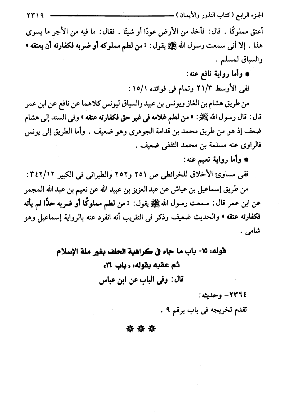 من طريق هشام بن الغاز ويونس بن عبيد والشاق ليونس كلاهما عن نافع عن ابن عمر قال: قال رسول اللَّه - صلى اللَّه عليه وسلم -: "من لطم غلامه في غير حق فكفارته عتقه" وفي السند إلى هشام ضعف إذ هو من طريق محمد بن قدامة الجوهرى وهو ضعيف. وأما الطريق إلى يونس فالراوى عنه مسلمة بن محمد الثقفي ضعيف.